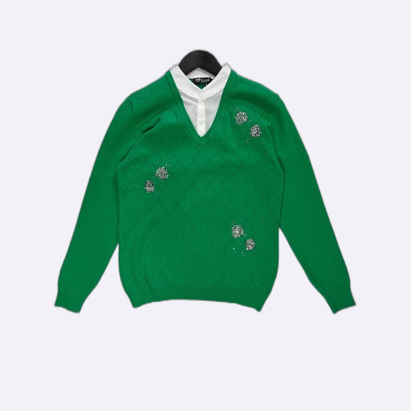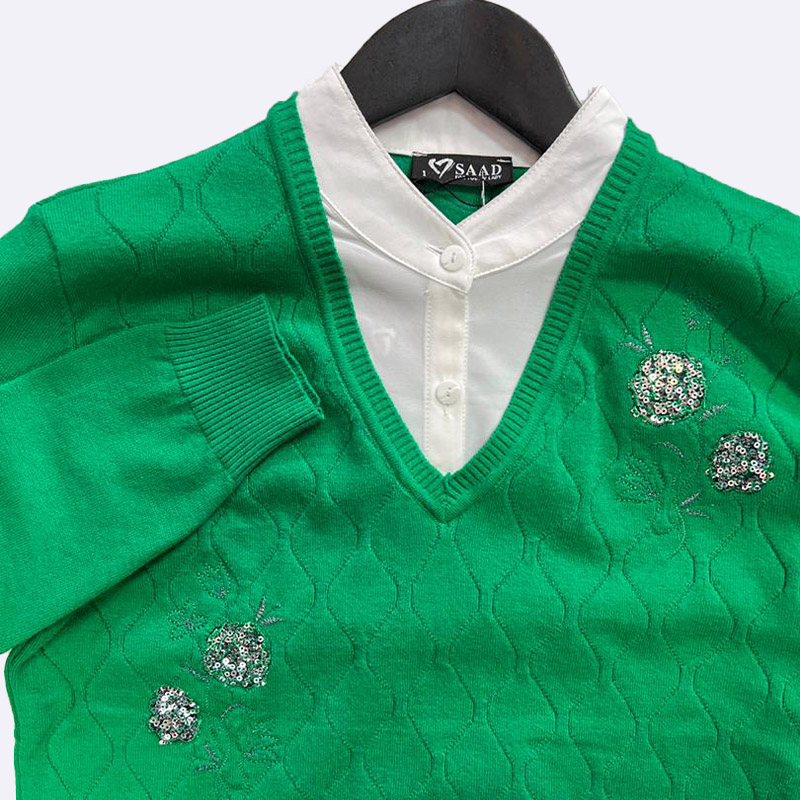 تألقي بإطلالة عصرية مع هذه الكنزة الخضراء الزمردية. تصميم أنيق ومطرز يضفي لمسة جمالية، مثالية لإطلالة متميزة.
