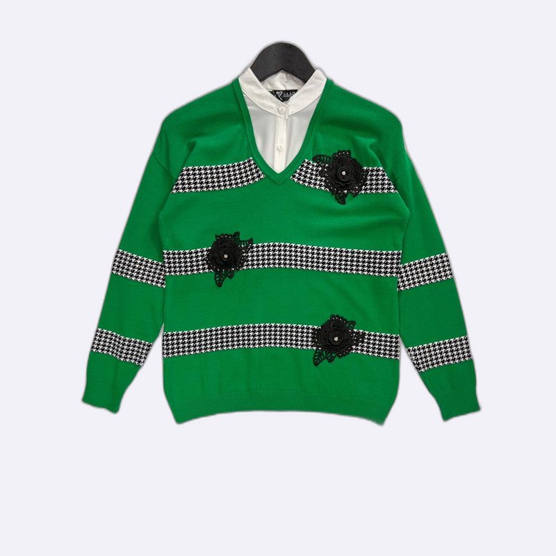 Houndstooth Trim V-Neck Sweater with Floral Appliqués