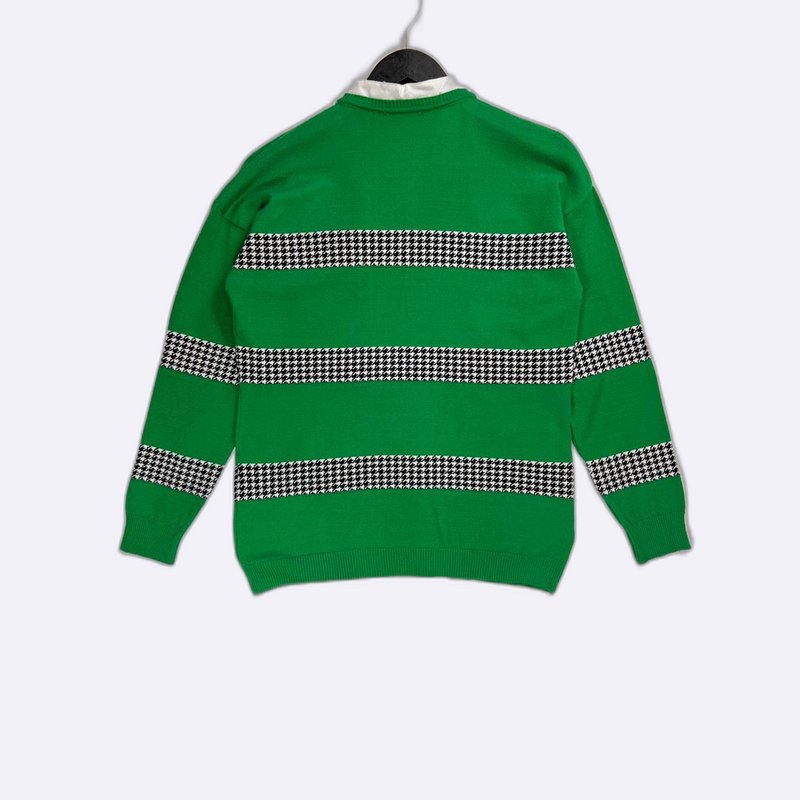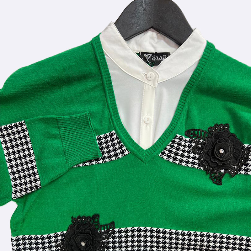 تألقي بإطلالة عصرية مع هذه الكنزة الصوفية الأنيقة. تصميم فريد يجمع بين نقشة الهاوندستوث الكلاسيكية وتطريزات الزهور الجذابة، مما يضفي لمسة أنثوية راقية.