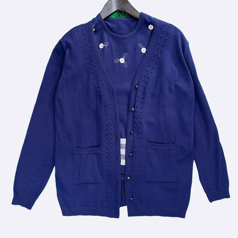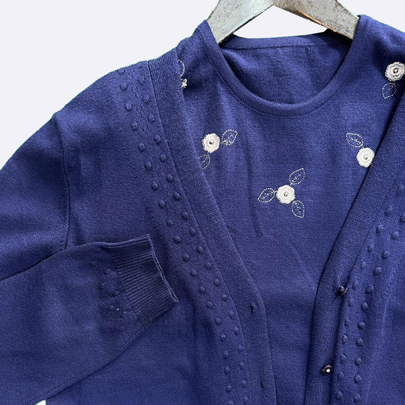 تألقي بأناقة مع هذا الطقم الرائع المكون من كارديجان وصدرية محبوكة. يتميز بتطريز الزهور الأنيق لإطلالة عصرية وجذابة.