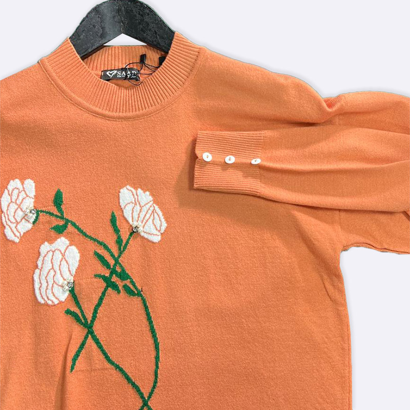 تألقي بإطلالة أنيقة ودافئة مع هذه الكنزة المطرزة بالورود. تصميم عصري بياقة عالية وأكمام طويلة يضفي لمسة جمالية على مظهرك.