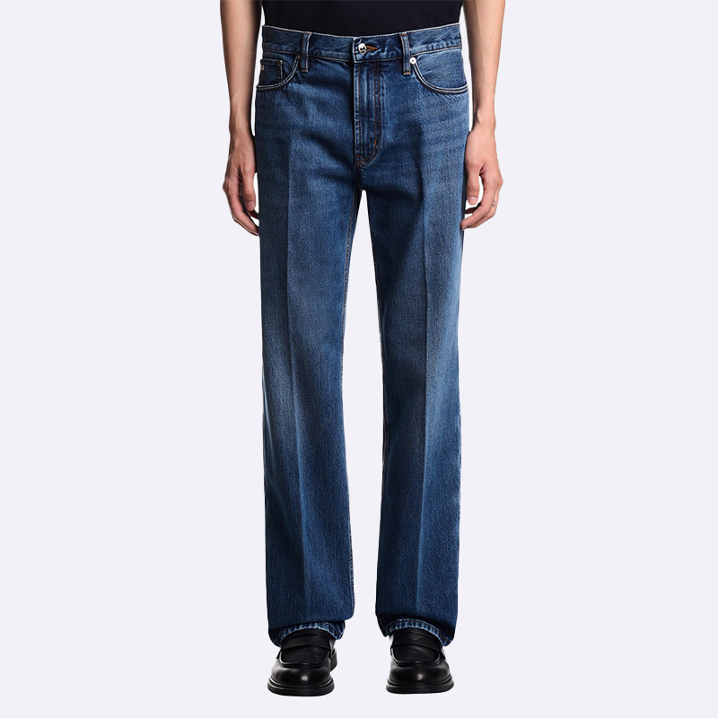 بنطال جينز رجالي أنيق بـ5 جيوب، تصميم كلاسيكي بلون أزرق متوسط أو أزرق فاتح. خامة عالية الجودة من القطن والإيلاستان لراحة مثالية، مع رقعة جلدية أصلية. مثالي لكل إطلالة