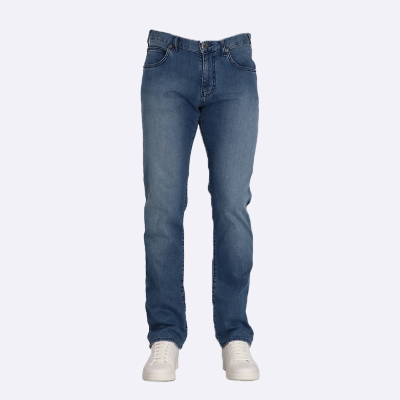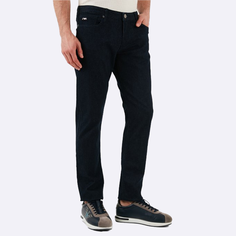 بنطال جينز رجالي بخصر متوسط و5 جيوب، متوفر بلون دنيم أزرق أو أسود أنيق. خامة مرنة من القطن والإيلاستان لراحة يومية، مع رقعة جلدية أصلية تضيف لمسة فاخرة
