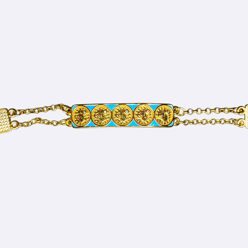 سوار بتصميم سلسلة مزدوجة رقيقة، يتميز بقطعة مركزية على شكل شريط مزين بأربع قلادات صغيرة على شكل عملات معدنية أو فصوص، ومثالي للارتداء اليومي.