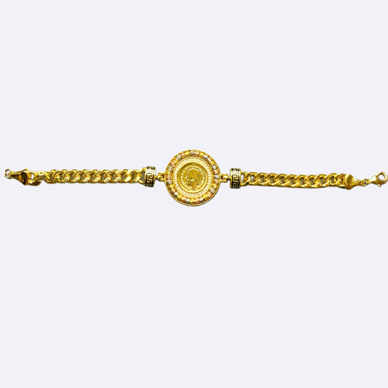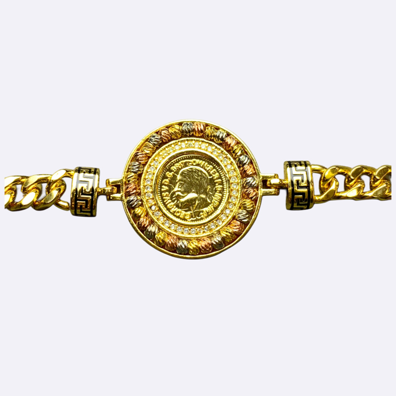 سوار يجمع بين سلاسل كوبية سميكة وتعليقة مركزية على شكل عملة قديمة محاطة بإطار مزخرف