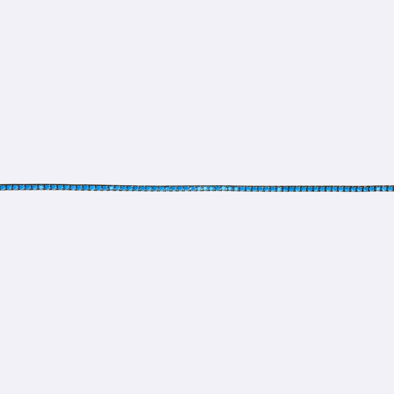 سوار أنيق بتصميم تنس كلاسيكي من فضة عيار 925، مرصع بالكامل بفصوص صغيرة بلون التركواز الأزرق الزاهي، مزود بسلسلة تمديد لضبط المقاس، مثالي للمظهر الصيفي والمميز.