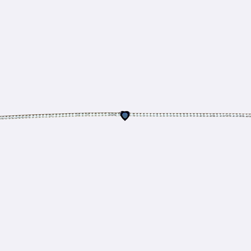 سوار تنس مرصع بأحجار زركون بيضاء براقة، يتوسطه حجر على شكل قلب باللون الأزرق الداكن (الكحلي/النيلي)، يجمع بين الأناقة الكلاسيكية والعصرية، مثالي للإطلالات المميزة.فضة عيار 925