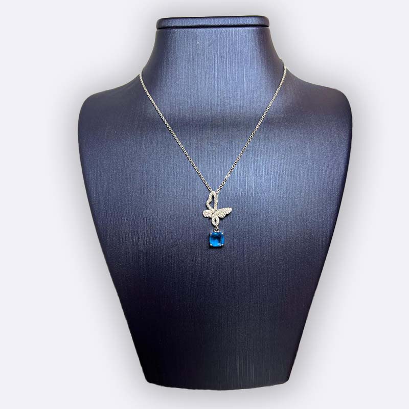 قلادة نسائية من فضة أصلية بتصميم فراشة أنثوي وكيوت، مزينة بحجر أنيق يضيف لمسة نعومة وجاذبية. قطعة خفيفة وعصرية، مثالية للإطلالة اليومية ولتنسيق ناعم يناسب البنات بأسلوب شبابي جذاب.