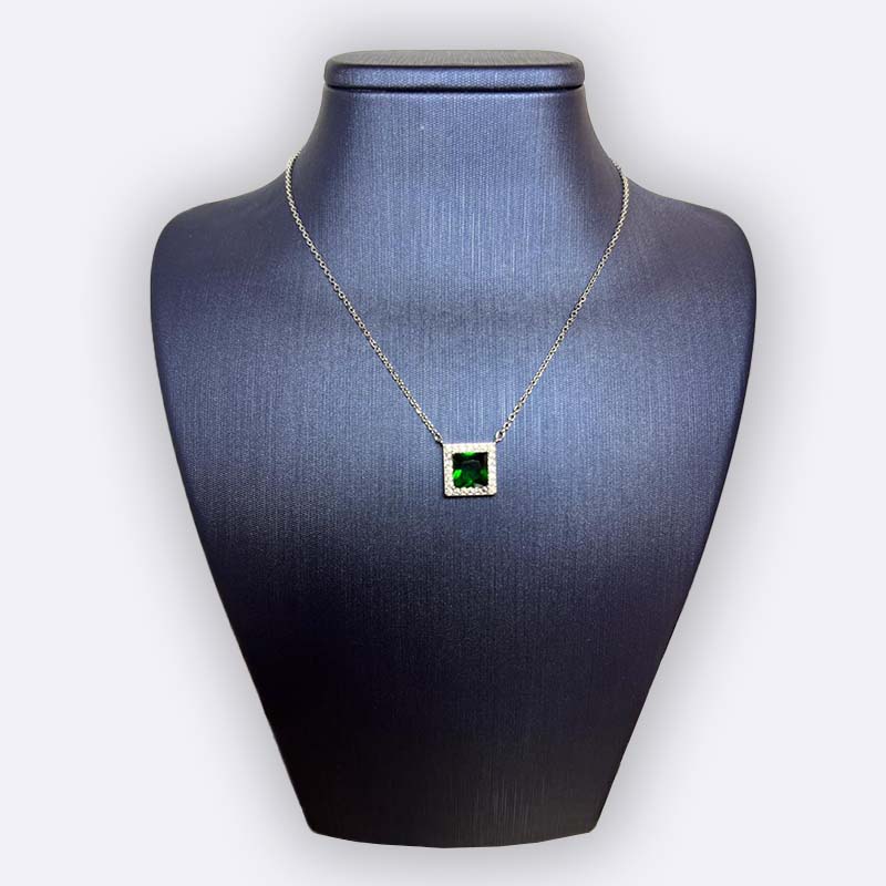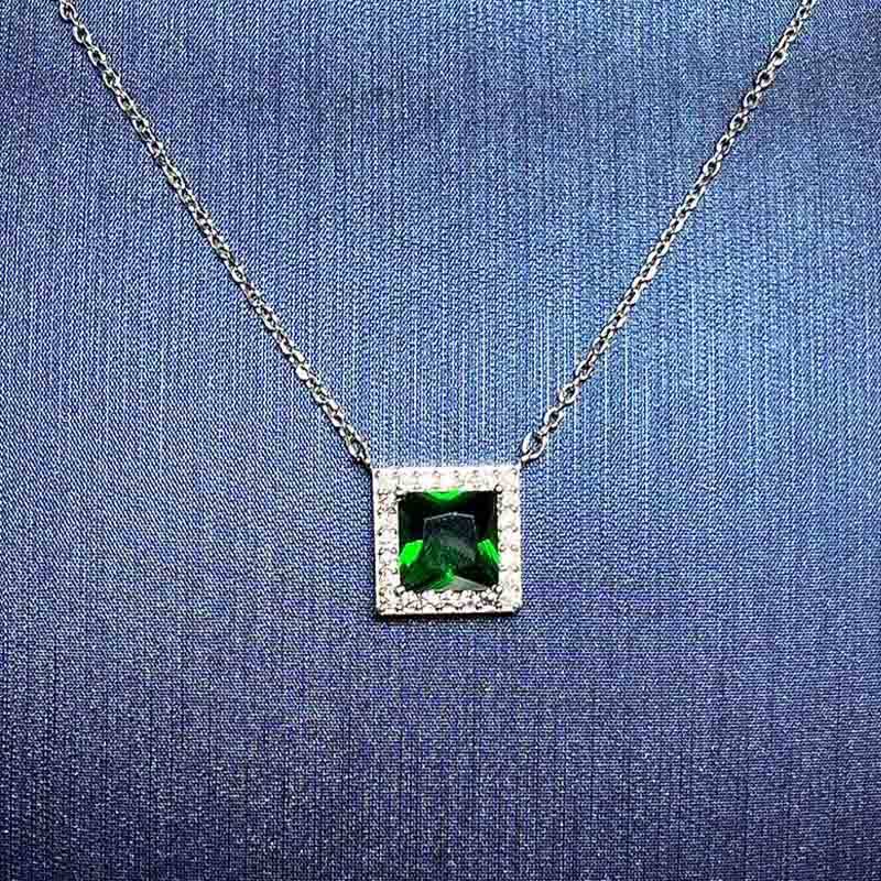 قلادة نسائية من فضة أصلية بتصميم مربّع أنثوي وعصري، باللون الفضي مع حجر أخضر بارز يضيف لمسة حيوية وكيوت. قطعة خفيفة وسهلة التنسيق، مناسبة للاستخدام اليومي وتمنح الإطلالة لمسة أناقة شبابية جذابة.