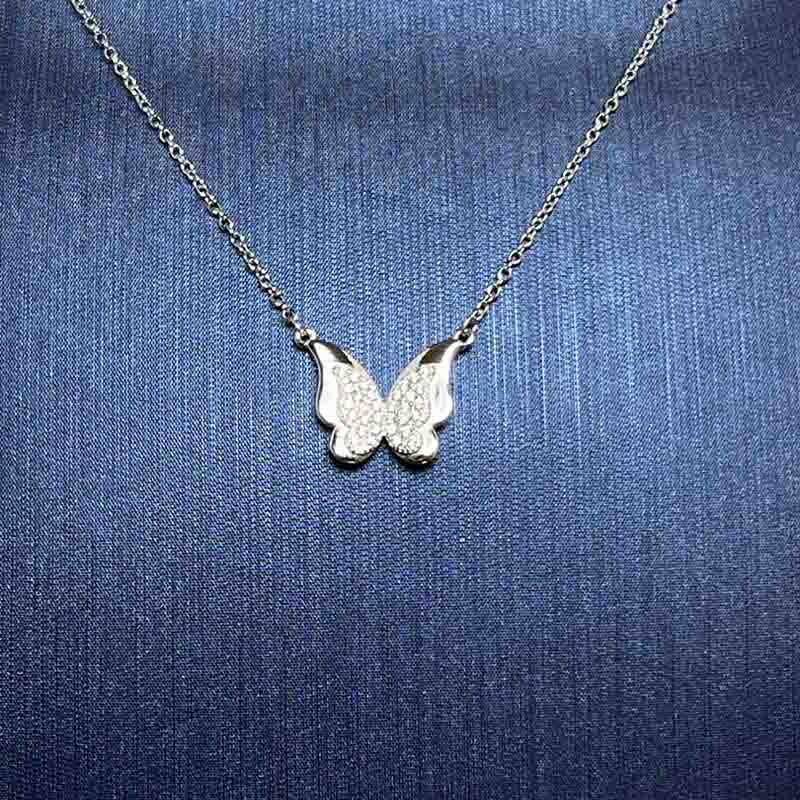 قلادة نسائية من فضة أصلية بتصميم فراشة أنثوي وكيوت، باللون الفضي مع حجارة شفافة تضيف لمسة لمعان ناعمة وأنيقة. قطعة خفيفة وسهلة التنسيق، مناسبة للاستخدام اليومي وتكمّل الإطلالة الشبابية بأسلوب راقٍ.