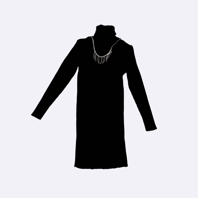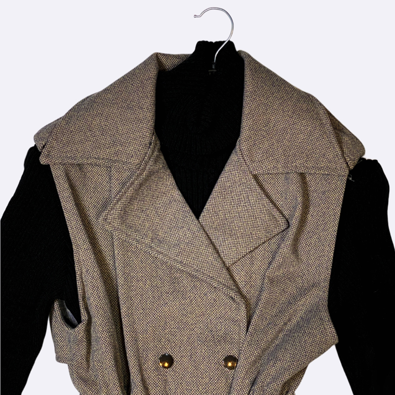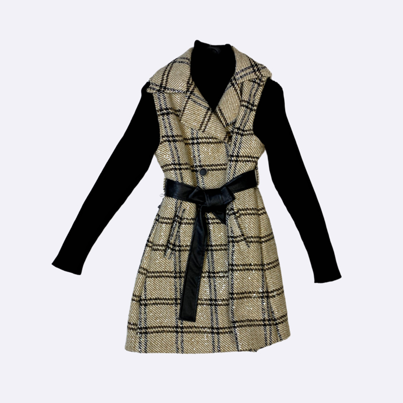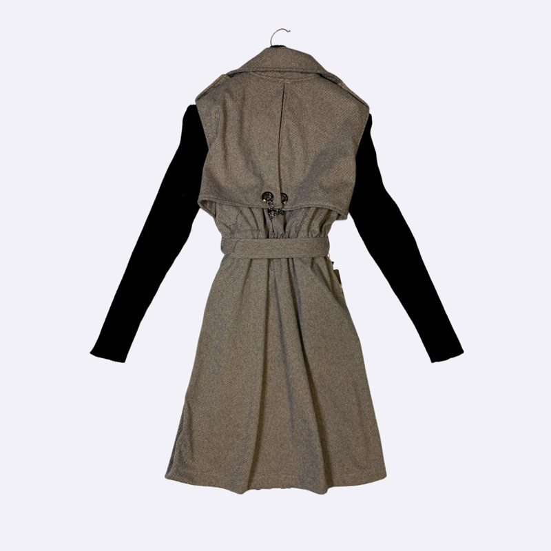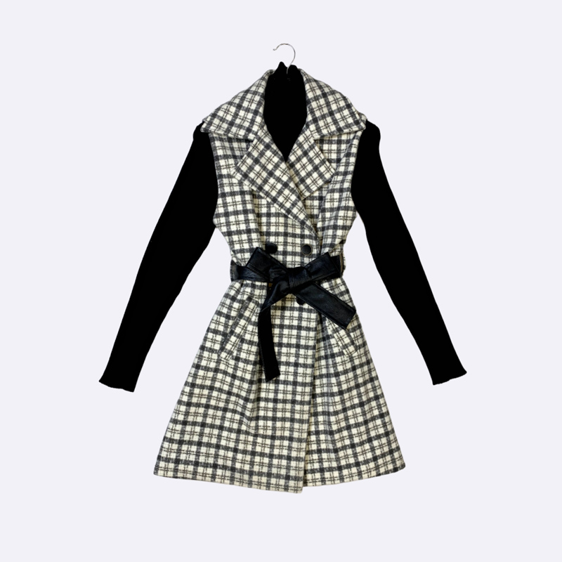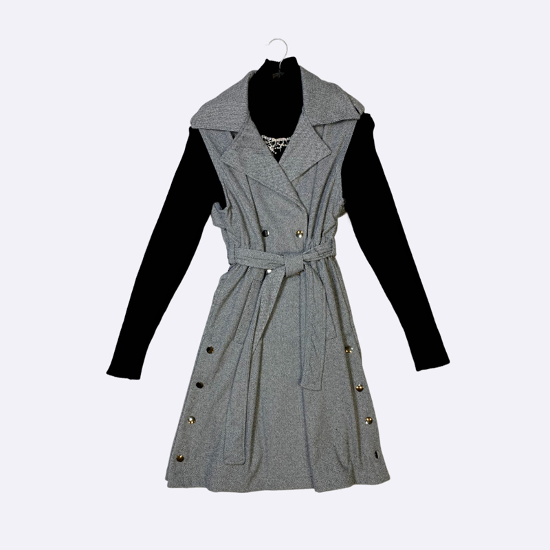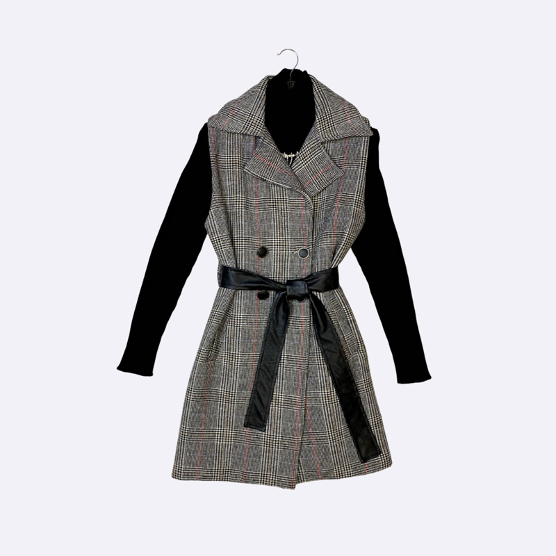 طقم أنيق يتكون من فيست طويل بصف أزرار مزدوج ورباط حول الخصر، وتوب شتوي بأكمام طويلة تحته.