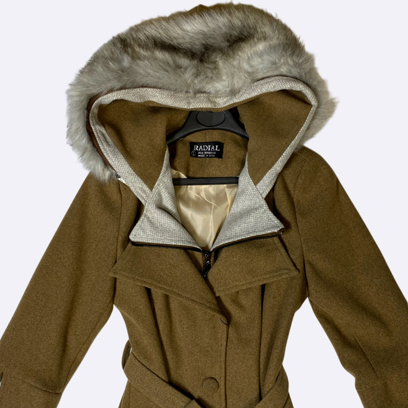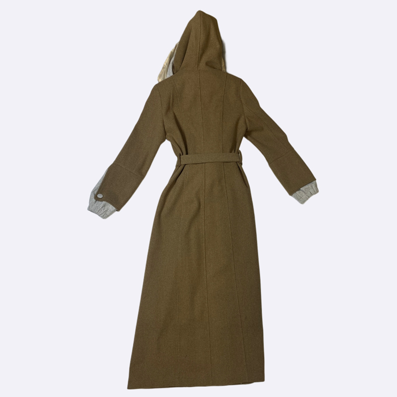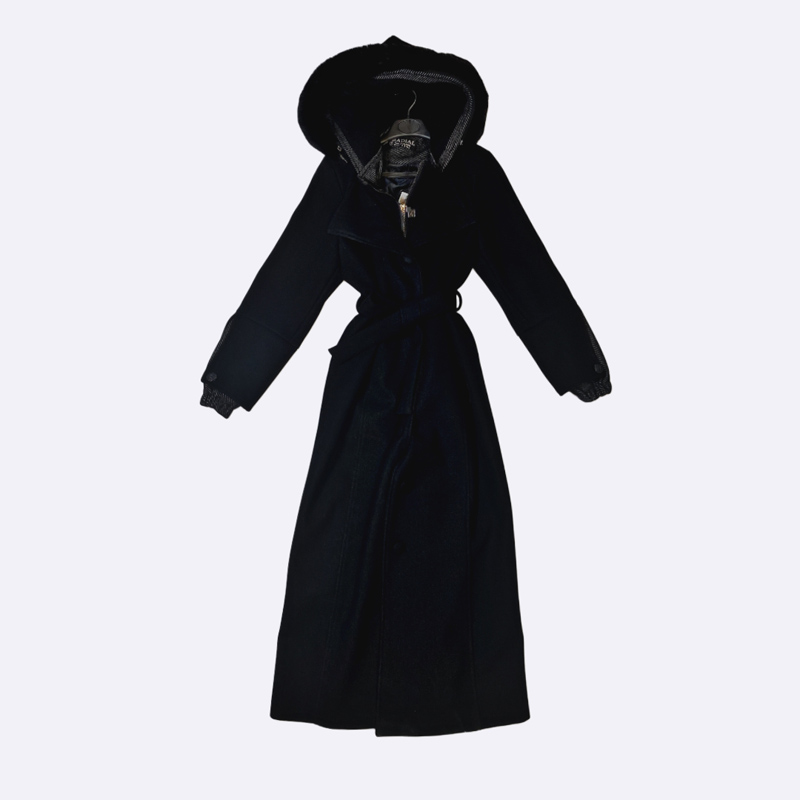 معطف شتوي طويل بقصة أنيقة، يتميز بغطاء رأس مبطن بالفرو الصناعي ورباط خصر وأزرار أمامية.