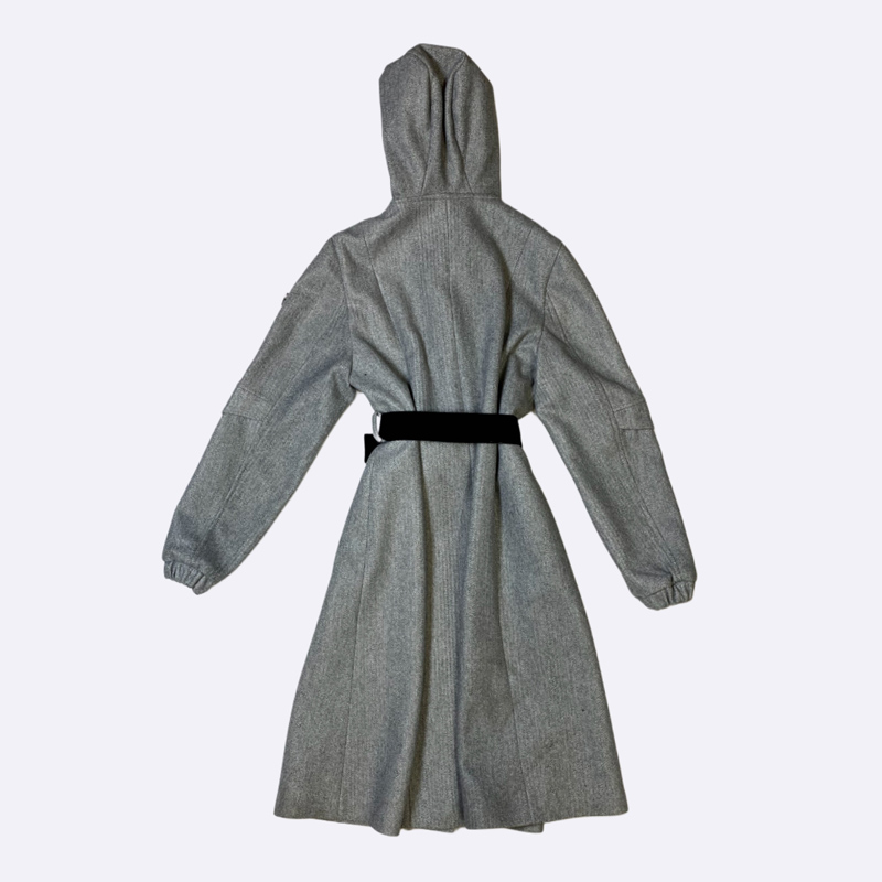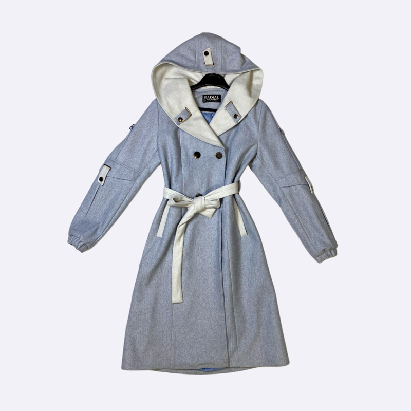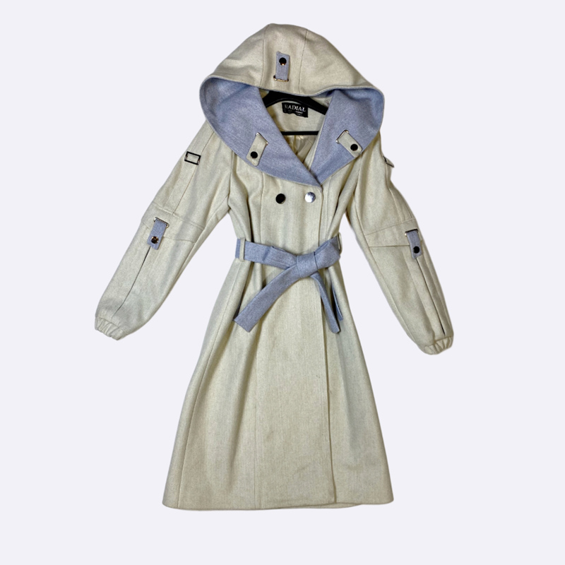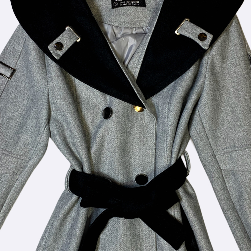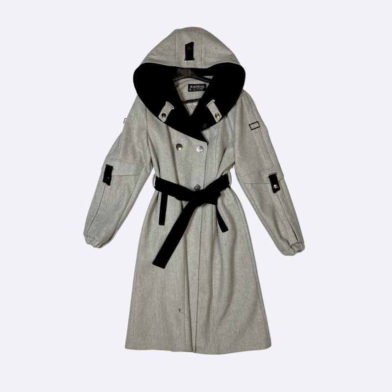 معطف طويل بتصميم عصري يتميز بغطاء رأس وياقة متباينة، مع رباط خصر وإبزيم على الأكمام، مثالي للطقس البارد.