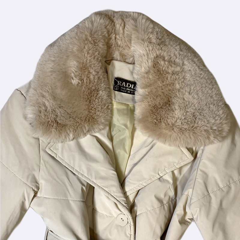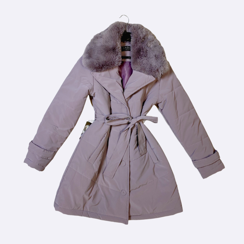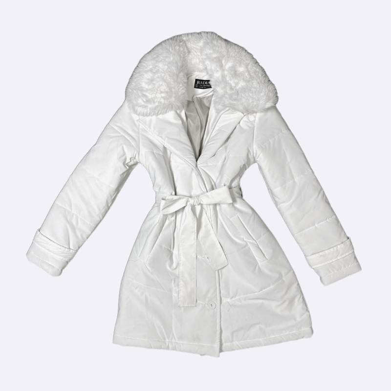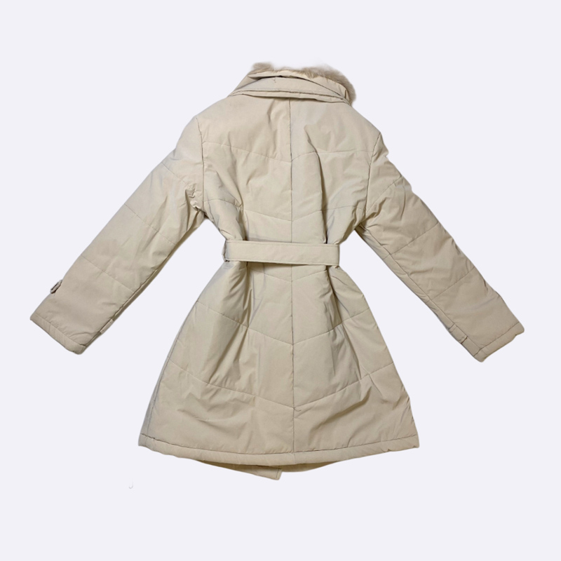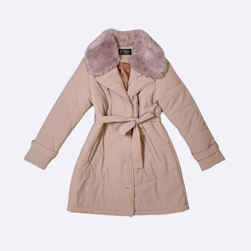 جاكيت شتوي مبطن بطول متوسط، يتميز بياقة من الفرو الصناعي ورباط خصر للإغلاق، مثالي للدفء والأناقة.