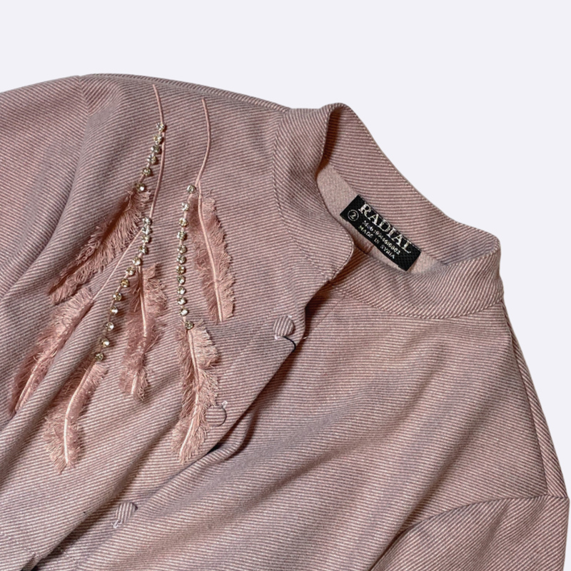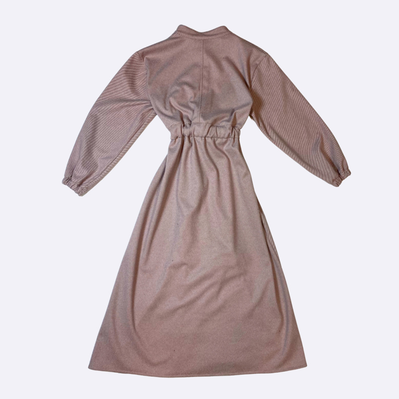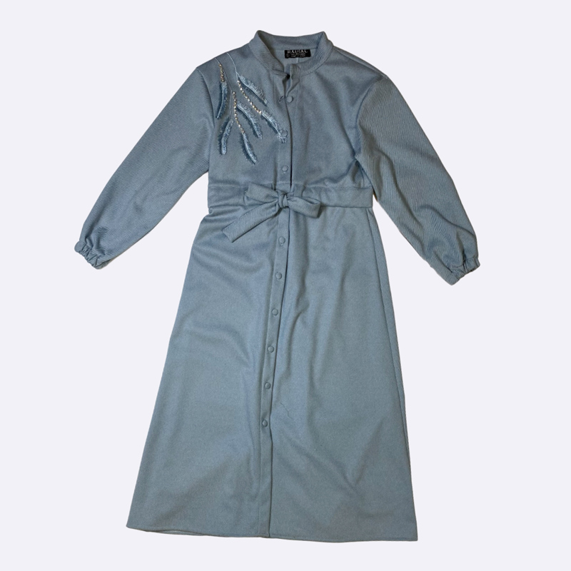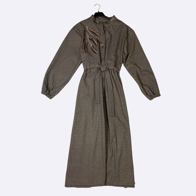 فستان محبوك طويل بياقة مرتفعة وأزرار، يتميز برباط خصر وبتفاصيل مطرزة تشبه الريش على الصدر.