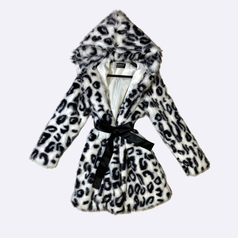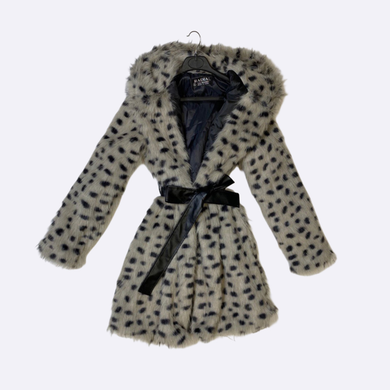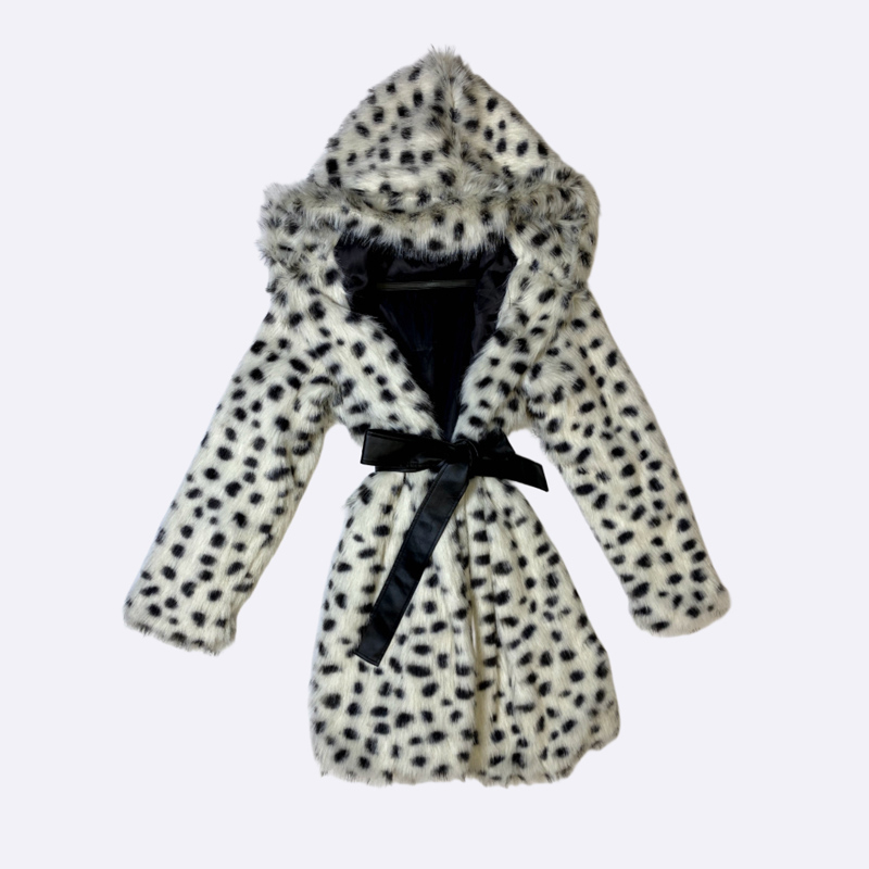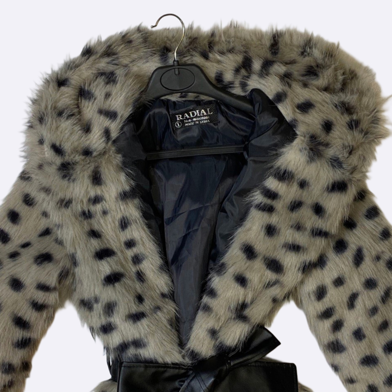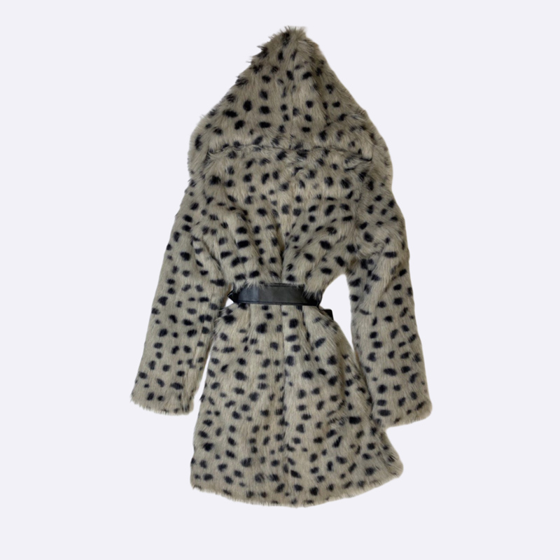 معطف قصير من الفرو الصناعي بطبعة مرقطة، مزود بغطاء رأس وحزام خصر من الجلد الصناعي.