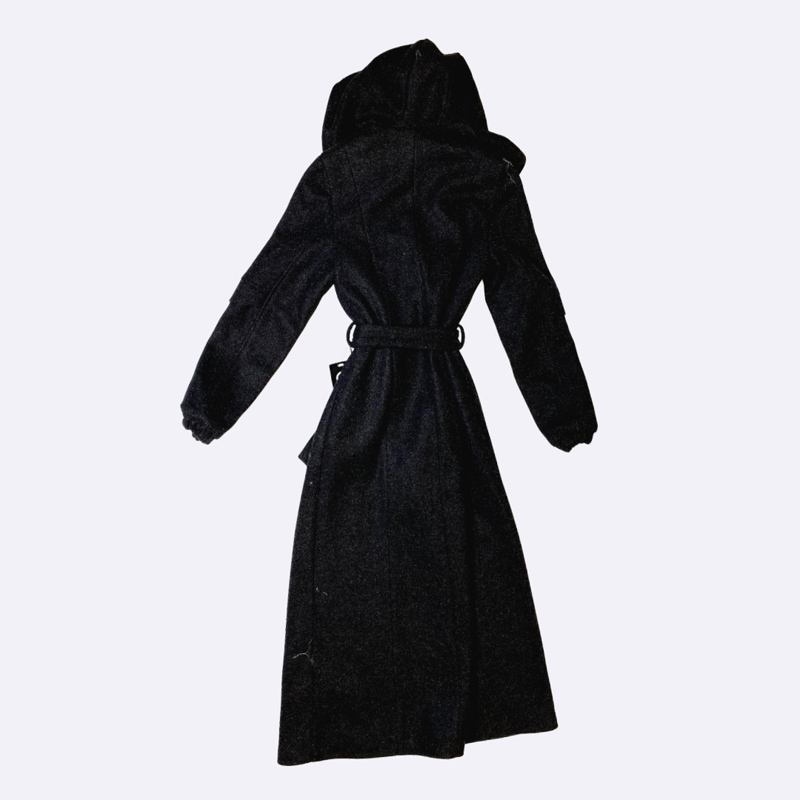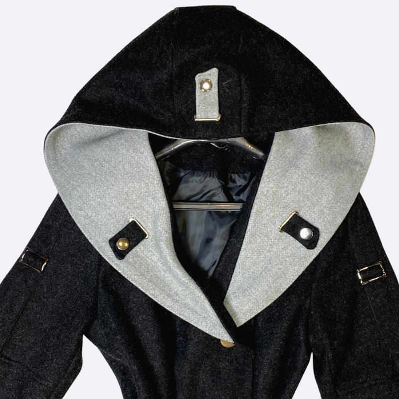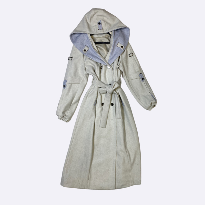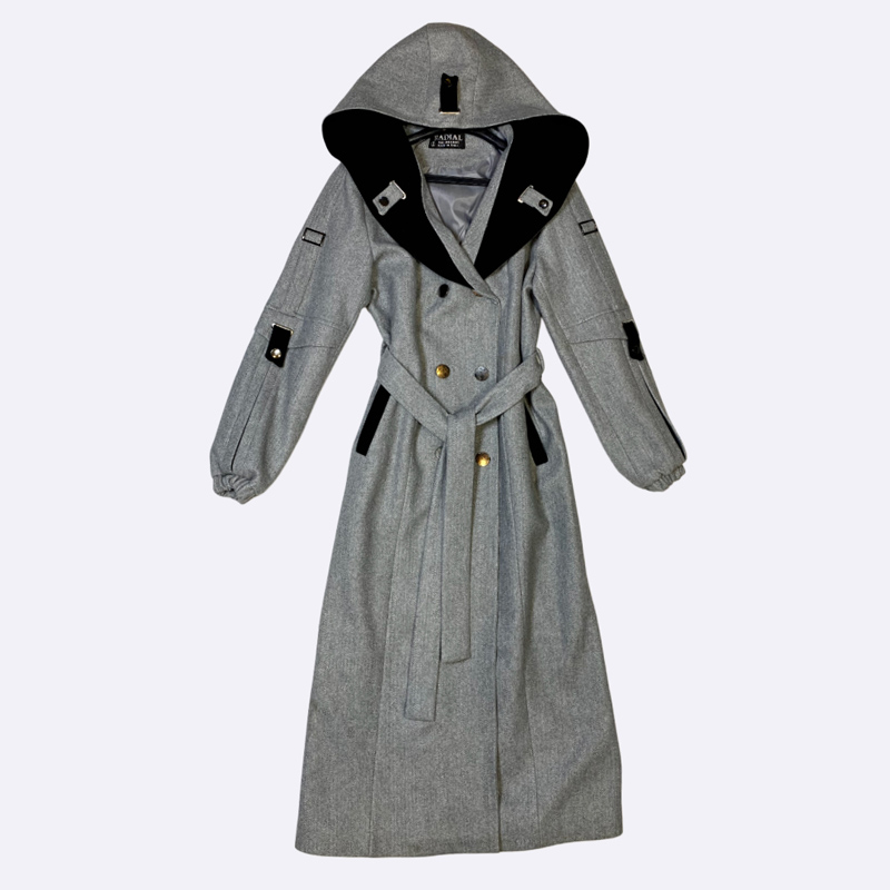 معطف طويل بطول 130 سم من قماش الجوخ، مزود بغطاء رأس ورباط خصر، يتميز بتفاصيل متباينة على الياقة والأكمام.