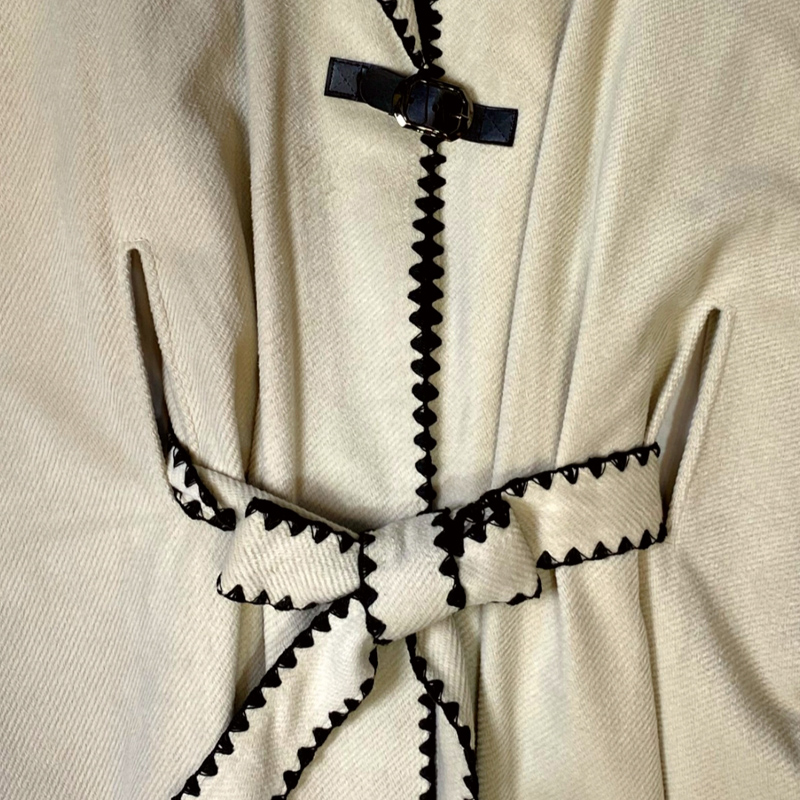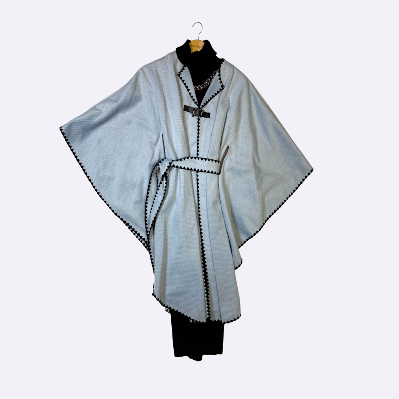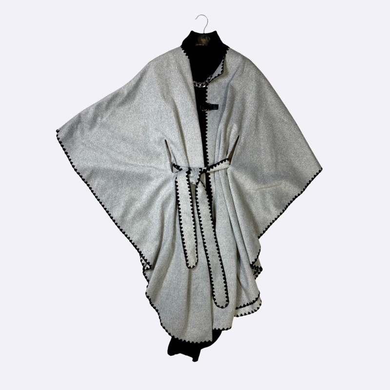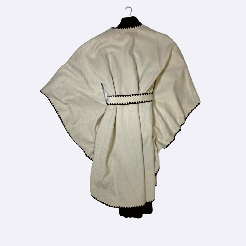 كاب طويل واسع وناعم بقصة واسعة على شكل فراشة، مزود بحزام للخصر وتفاصيل حواف متباينة تزينه.