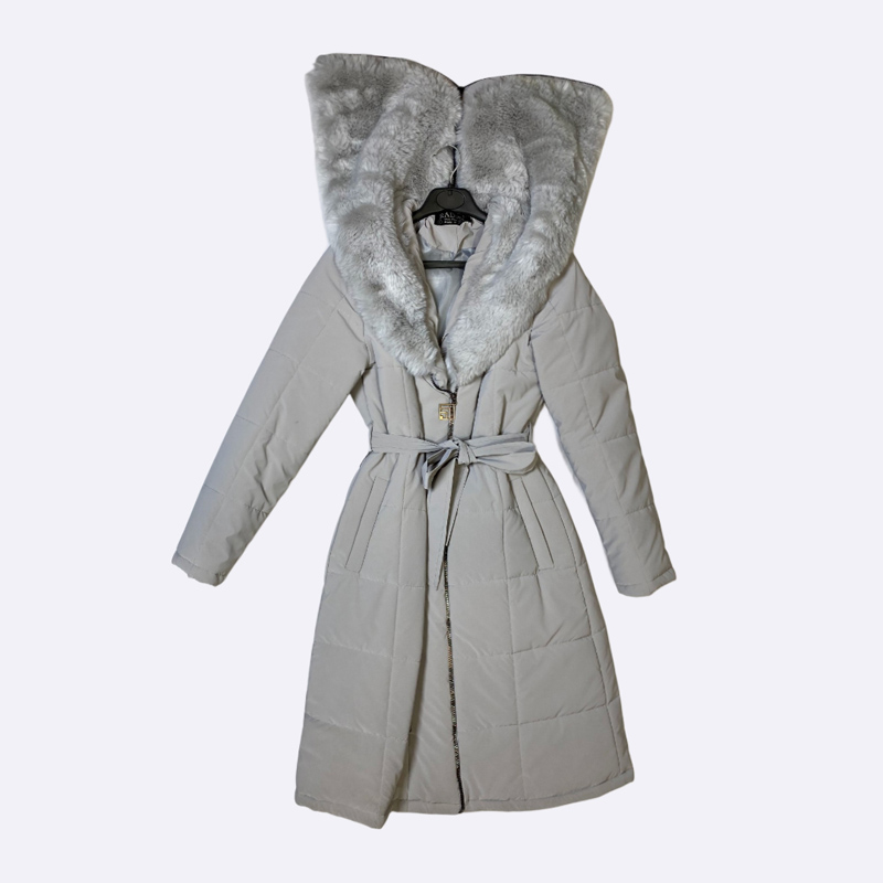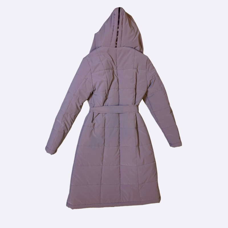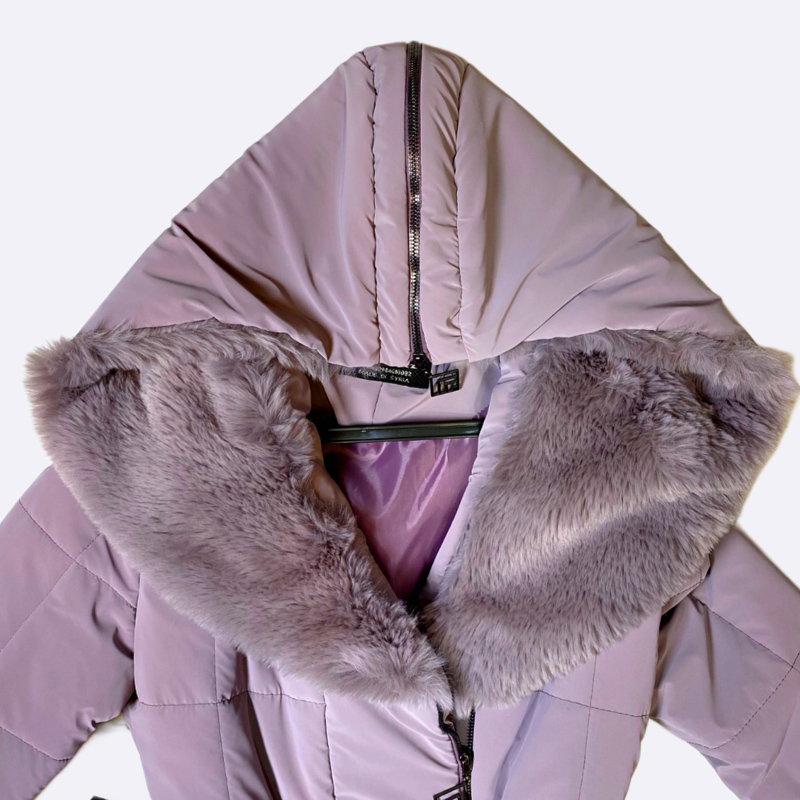 جاكيت طويل مبطن ودافئ بقماش مضغوط "Puffer"، يتميز بغطاء رأس كبير مبطن بالفرو الصناعي وحزام خصر للتحكم بالمقاس.