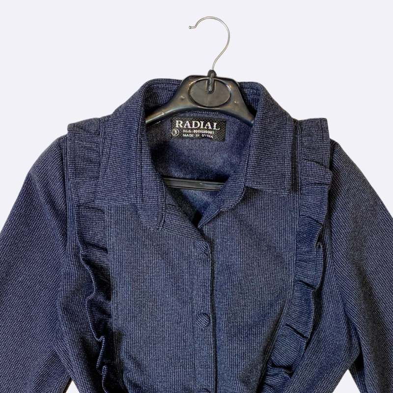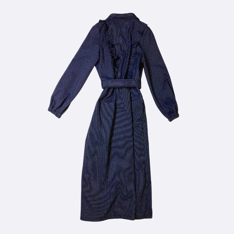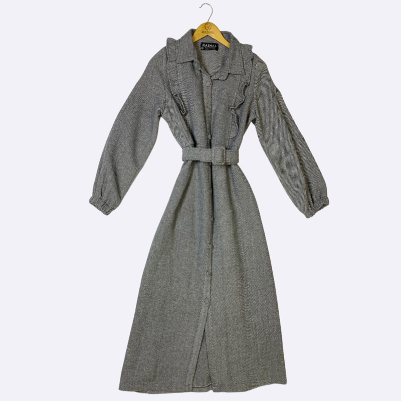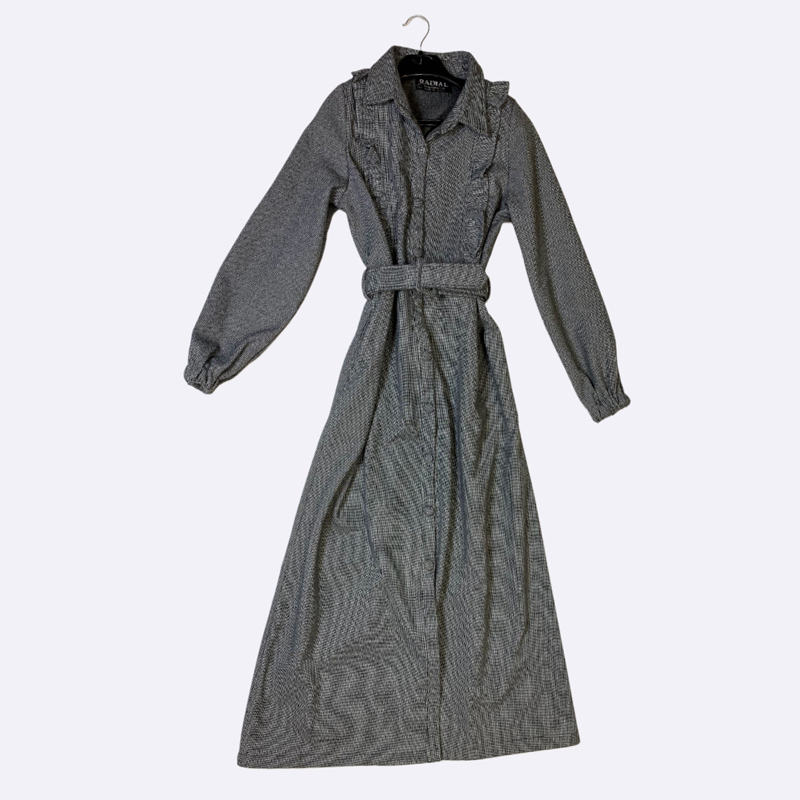 فستان طويل بأكمام منفوخة وخصر محدد بحزام عريض بإبزيم، يتميز بتصميم قميص ويزين الصدر كشكشة عمودية ناعمة.