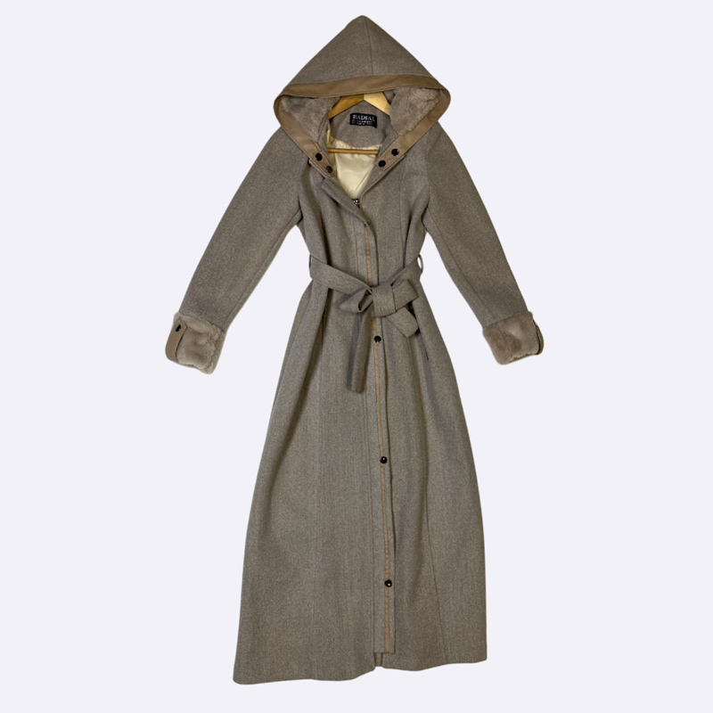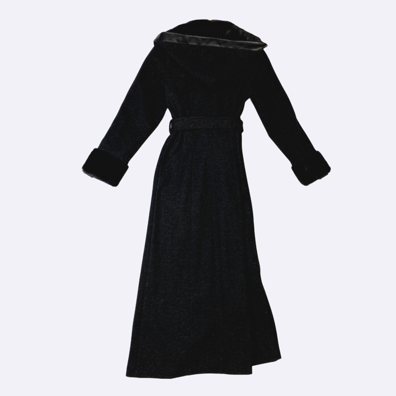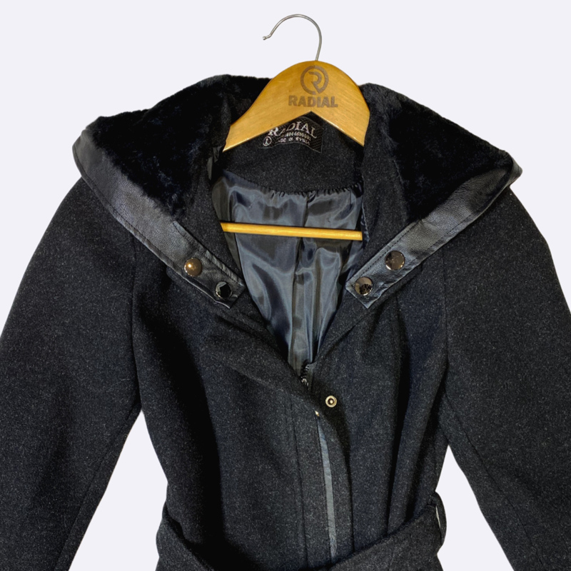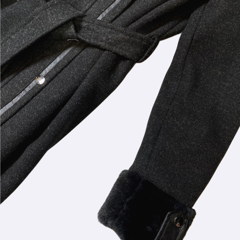 مانطو جوخ (مزيج الصوف) طويل ودافئ مع غطاء رأس، مزين بتفاصيل وحواف من الجلد الصناعي على الأطراف، ويغلق بأزرار وسحاب بالإضافة إلى حزام للخصر.