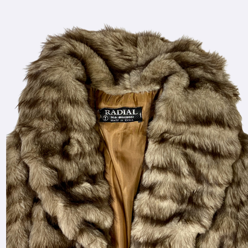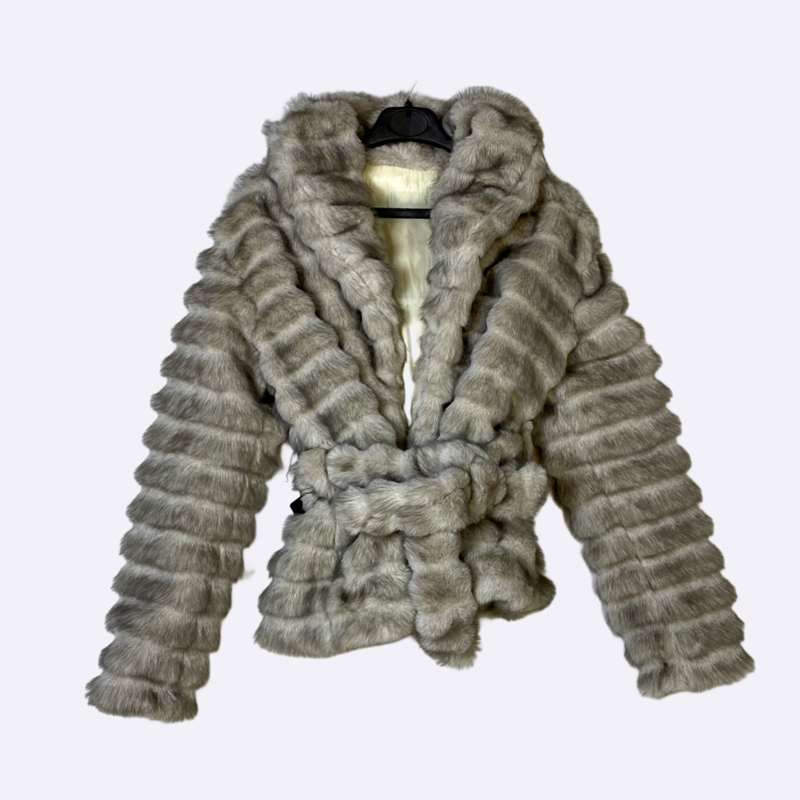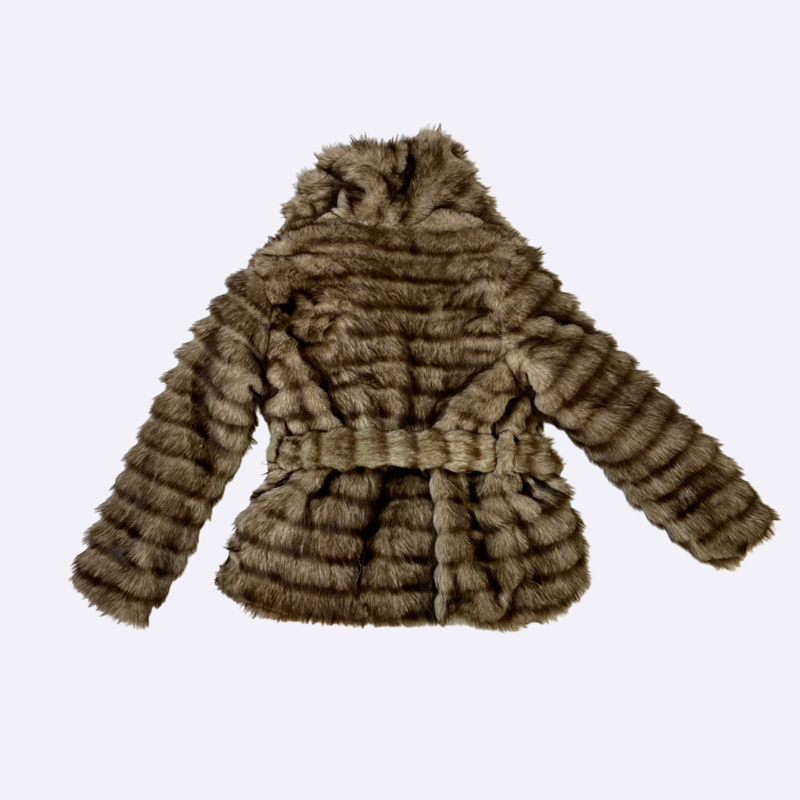 جاكيت فرو صناعي قصير ومميز بنمط مخطط أفقي، يتميز بياقة عريضة ويغلق برباط حزام عند الخصر.
