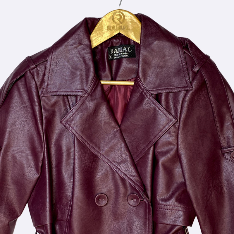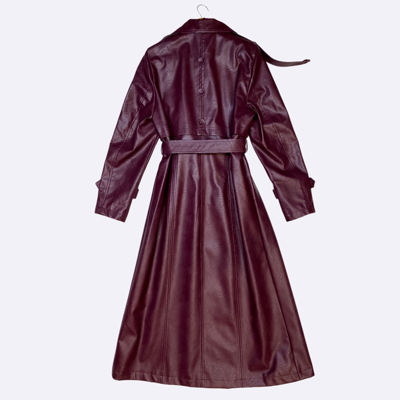 معطف طويل (مانطو) بتصميم ترانش كلاسيكي مصنوع من الجلد الصناعي. يتميز بياقة مطوية، صف أزرار مزدوج أمامي، حزام خصر عريض للربط، وأشرطة على الأكمام، وهو قطعة مميزة للإطلالات الشتوية والخريفية.