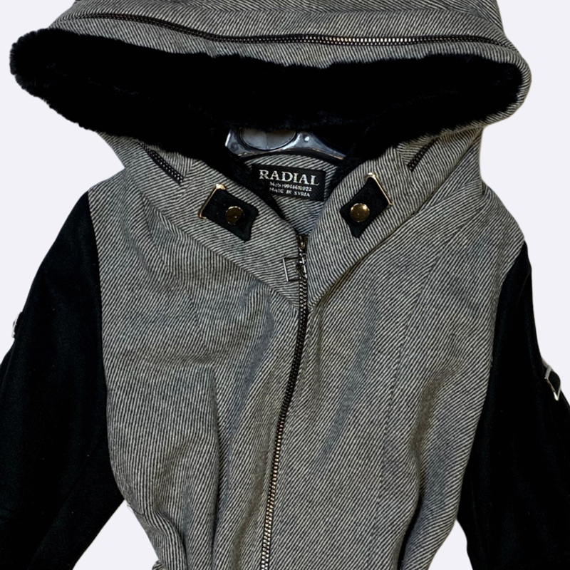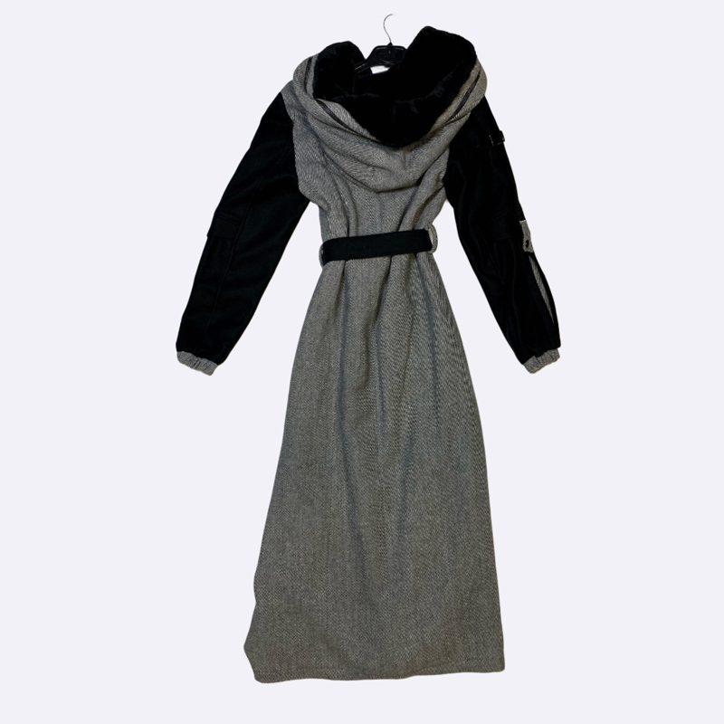معطف طويل شتوي يجمع بين خامة الجوخ المنقوشة (نقشة متعرجة) في الجسم، وخامة مغايرة في الأكمام. يتميز بغطاء رأس وحزام خصر للربط، مع تفاصيل أشرطة وأزرار على الأكمام، مما يمنحه إطلالة عصرية ومميزة.