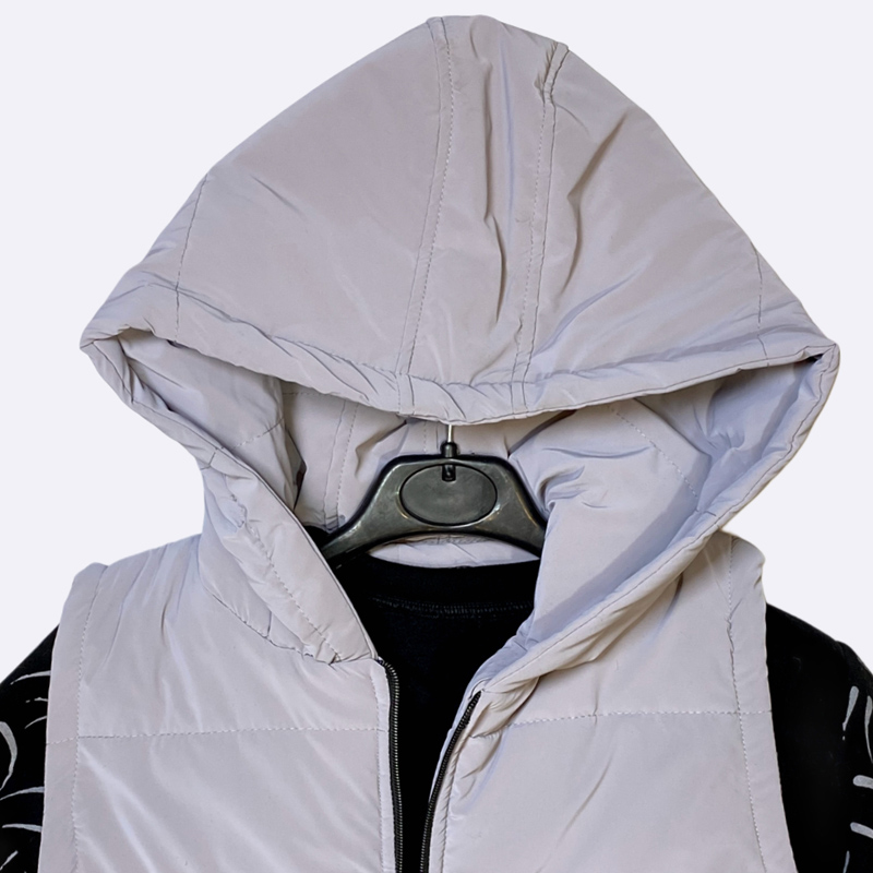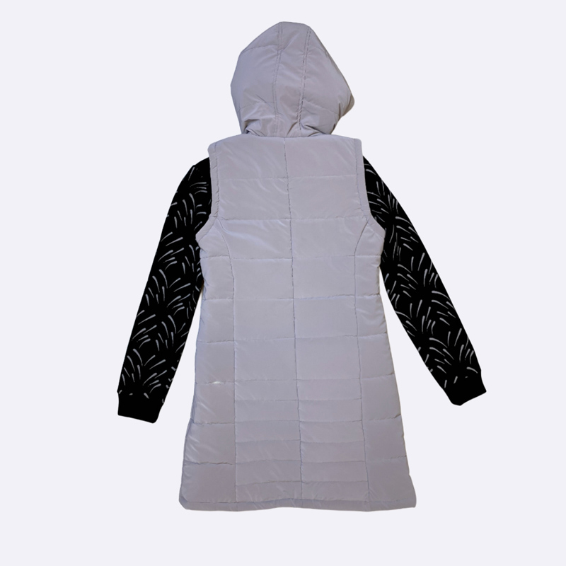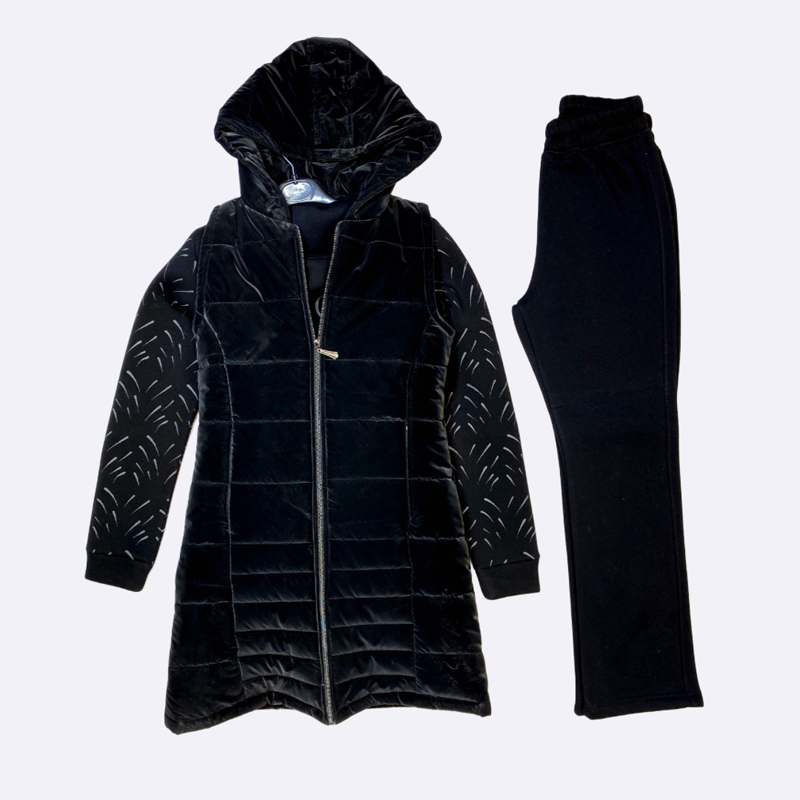 طقم من ثلاث قطع للارتداء المنزلي يتميز بدفئه. يتكون من فيست (سترة) طويل منفوخ بغطاء رأس بسحاب أمامي، وبنطال بخصر مطاطي، وبلوزة بأكمام طويلة بتصميم منقوش، وجميع القطع مناسبة للراحة في الأجواء الباردة.