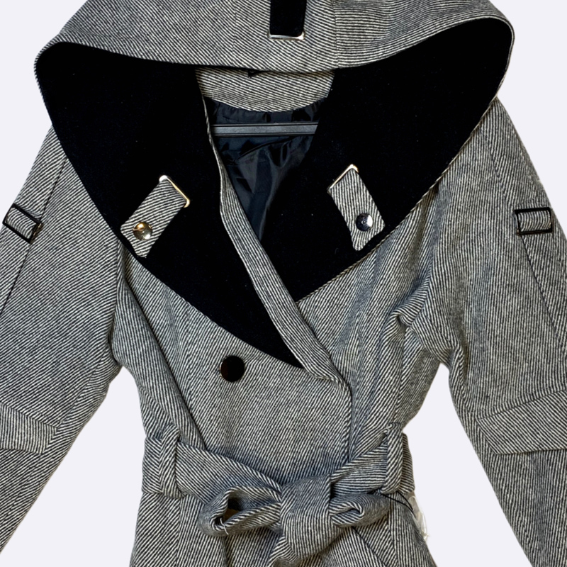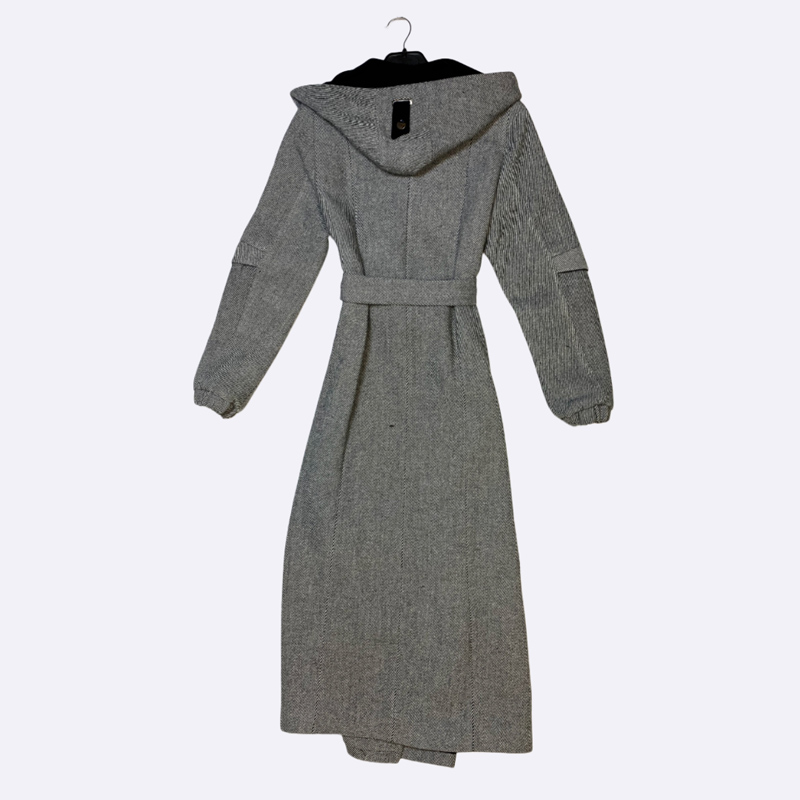 معطف طويل (مانطو) بتصميم ترانش، مصنوع من الجوخ بنقشة متعرجة (هيرنغ بون). يتميز بغطاء رأس وحواف متباينة، وإغلاق مزدوج بأزرار، وحزام خصر للربط. يحتوي على جيوب وتفاصيل أشرطة على الأكمام، وهو مثالي لإطلالة شتوية عصرية.