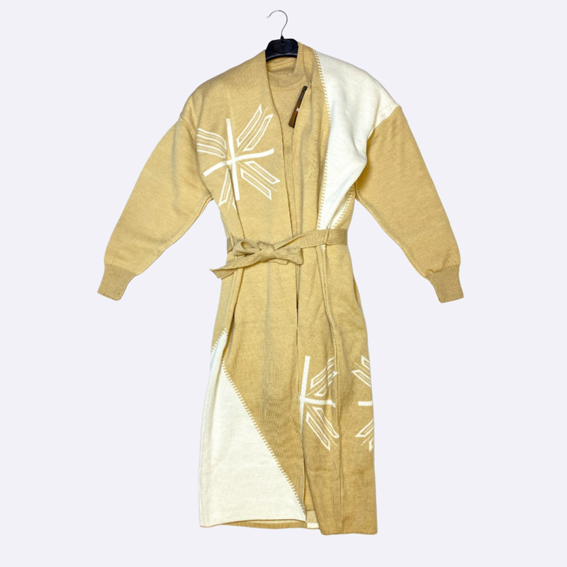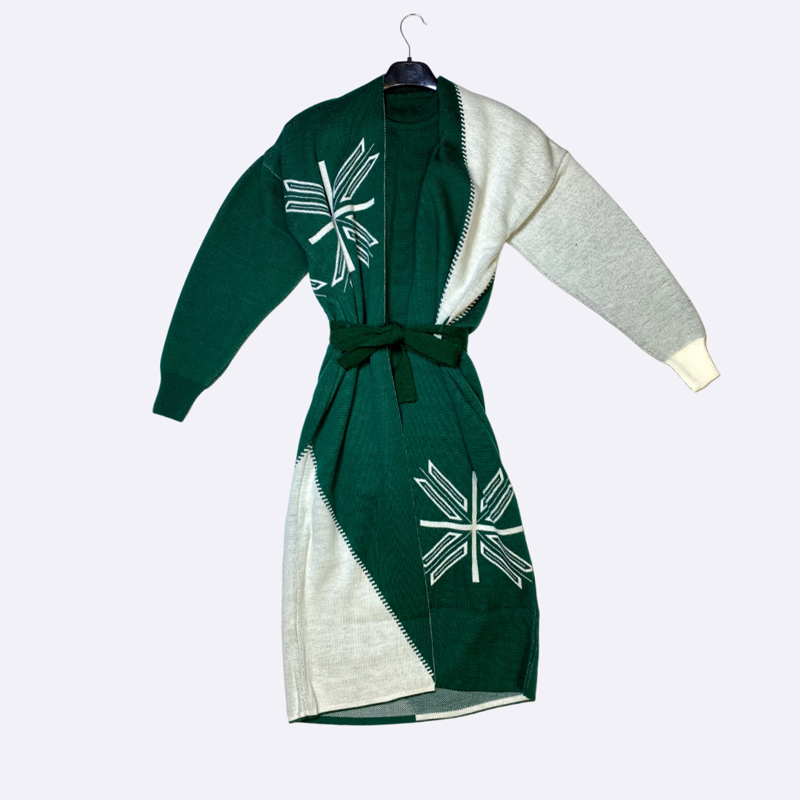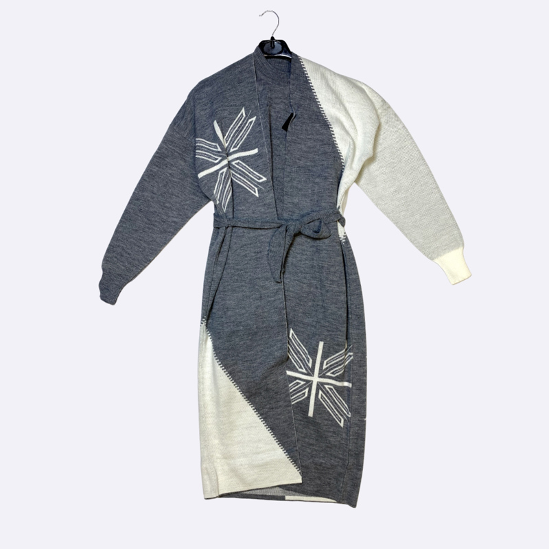 كارديغان طويل منسوج (تريكو) يتميز بتصميم هندسي متباين (نصفين بلونين مختلفين). مزين بنقوش نجمية مطرزة على الواجهة، ويأتي بربطة خصر قابلة للتعديل.