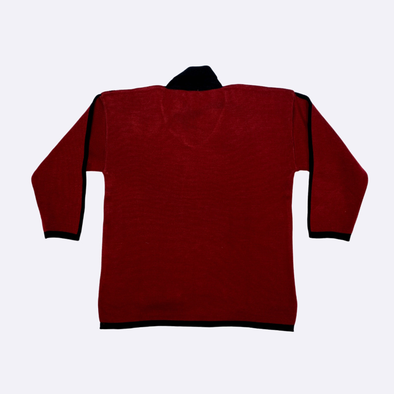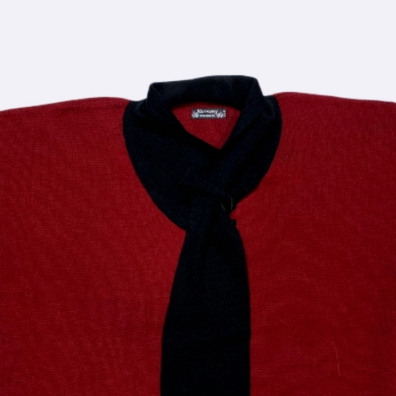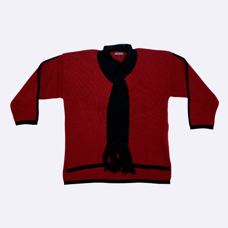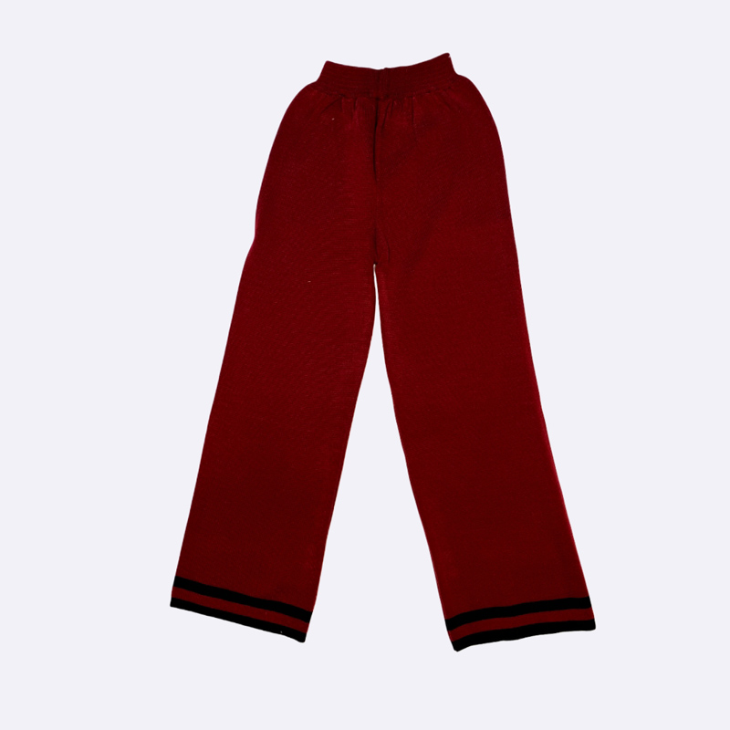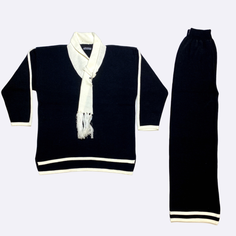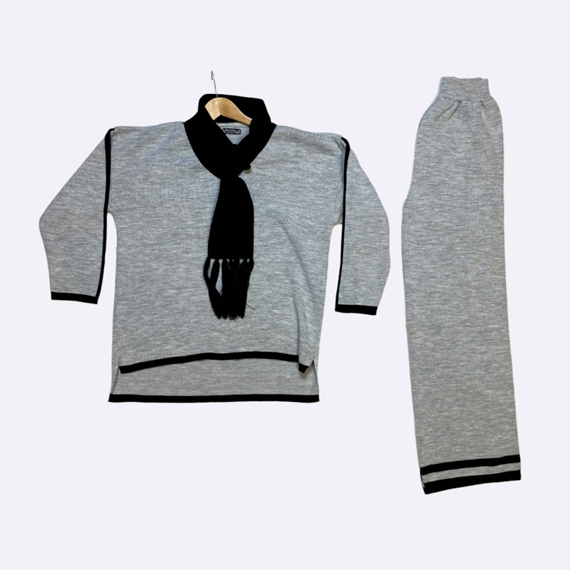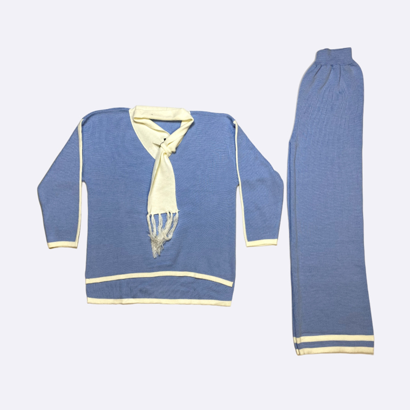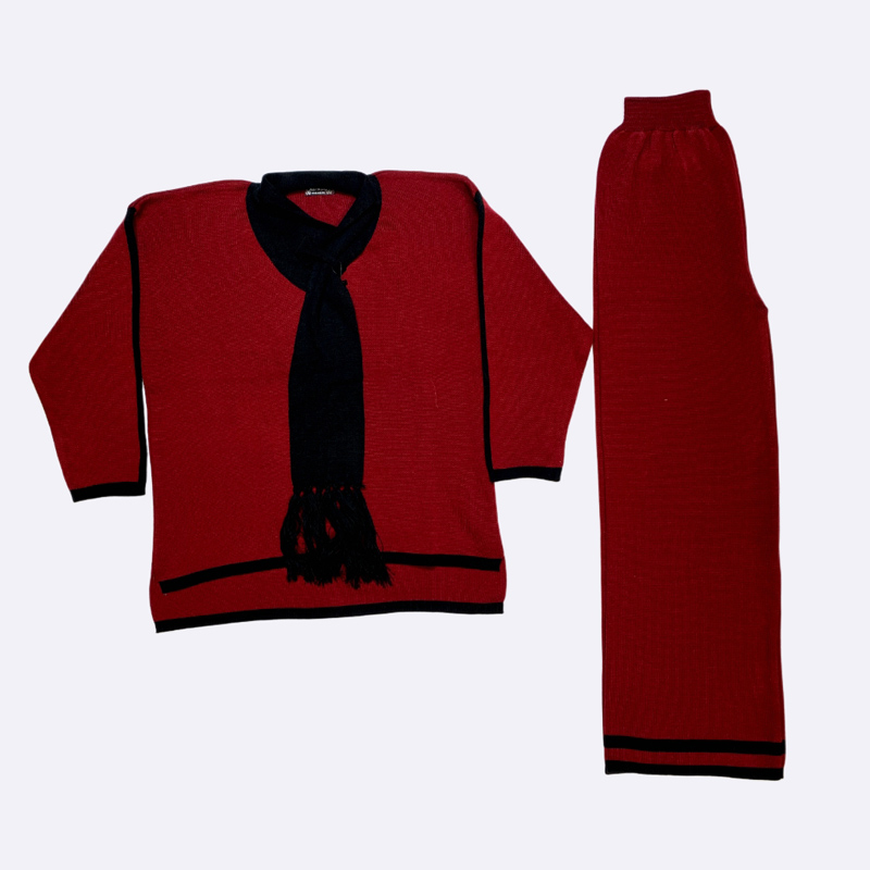 طقم مريح من التريكو مكون من كنزة بأكمام ثلاثة أرباع وحواف مزينة بخطوط متباينة، مع وشاح رفيع متناسق، وبنطلون طويل سادة ذي حافة مزينة بخط متباين.