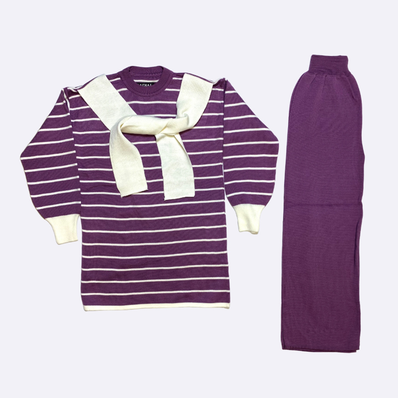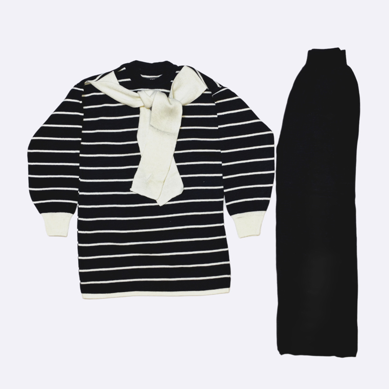 طقم مريح من التريكو، يتكون من كنزة مخططة أفقيًا بياقة بيضاء على شكل حرف X، وبنطلون طويل سادة من نفس النسيج المحبوك.