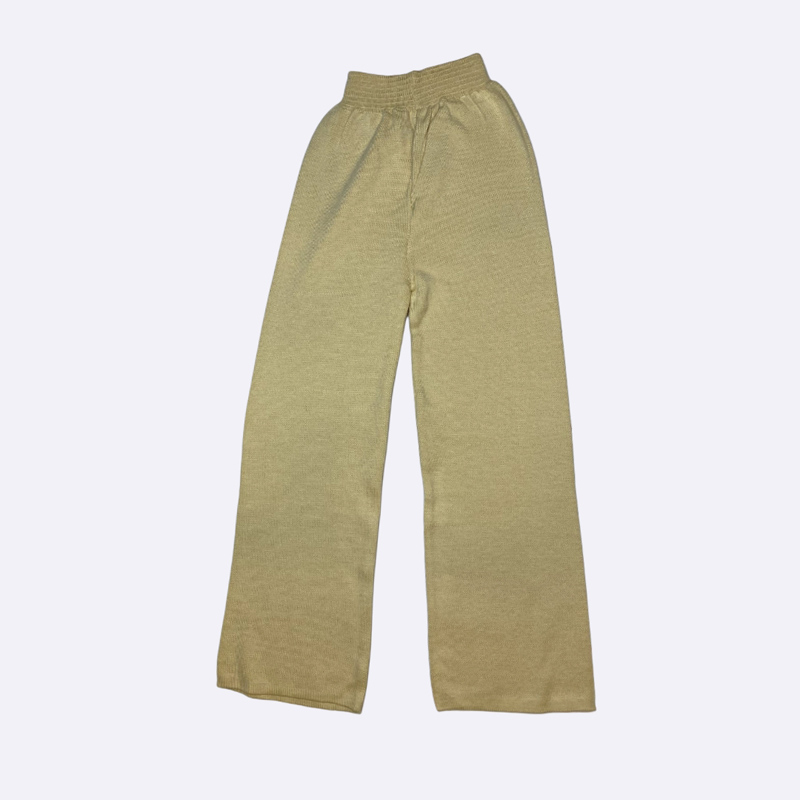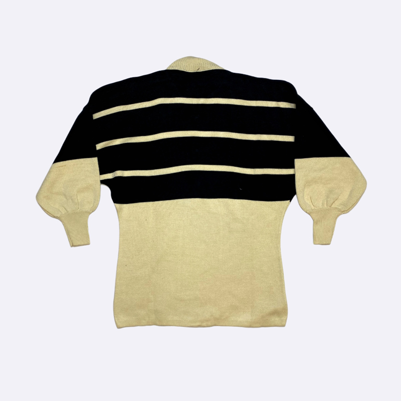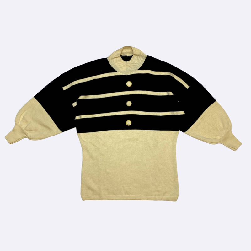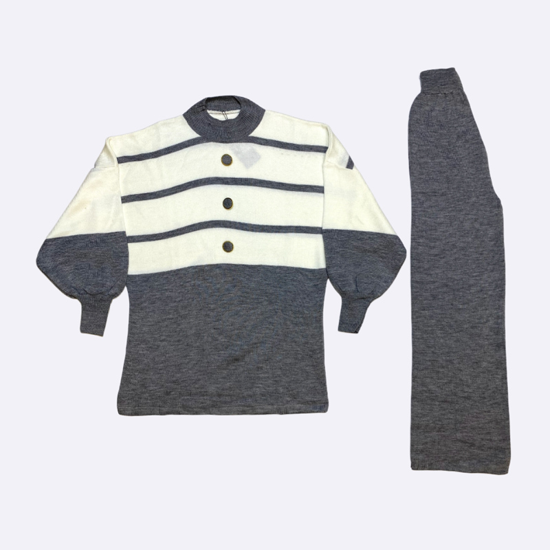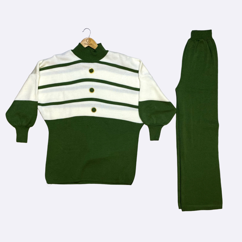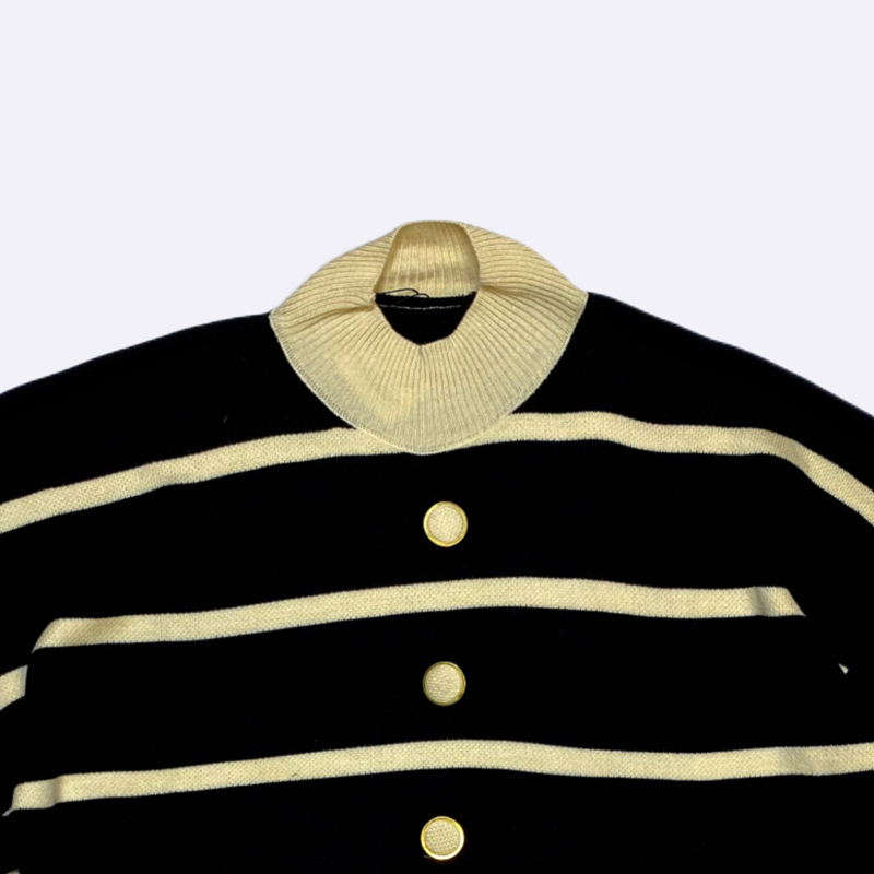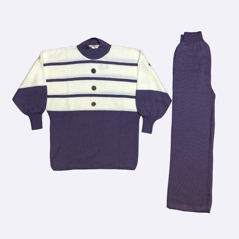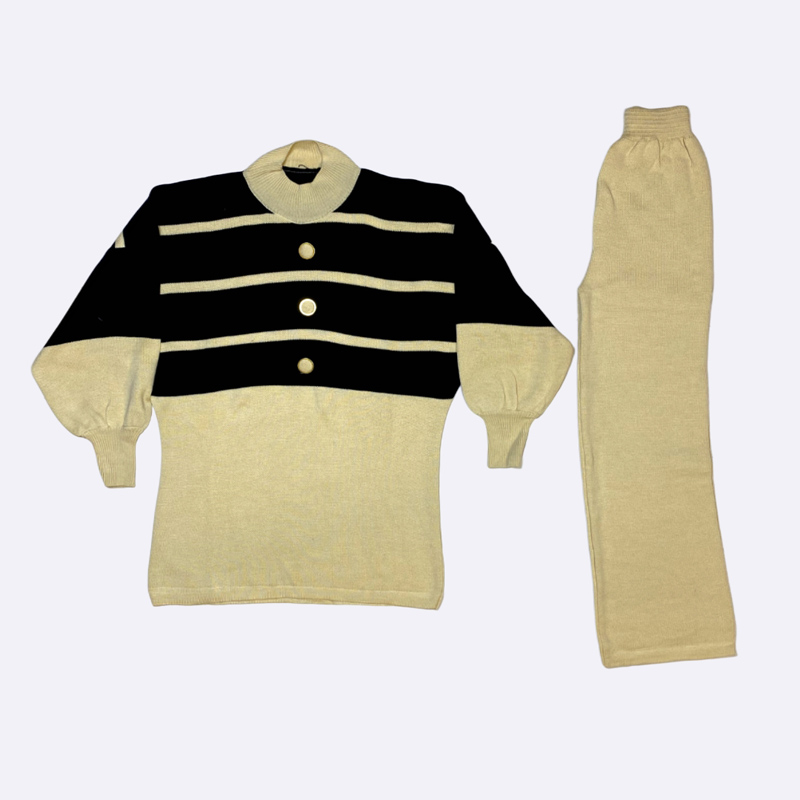 طقم مريح من قطعتين من التريكو، يتميز بكنزة بياقة واقفة وأكمام واسعة، مزينة بخطوط عريضة متباينة وأزرار أمامية كبيرة، مع بنطلون طويل سادة متناسق.