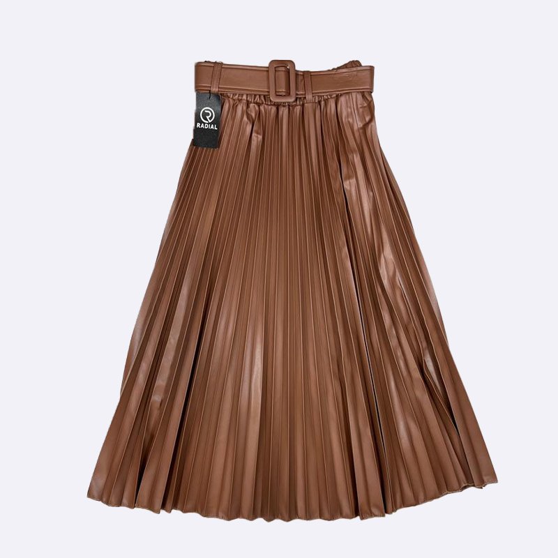 تألقي بأناقة مع هذه التنورة الميدي المصنوعة من الجلد الصناعي بكسرات أنيقة وحزام عصري. مثالية لإطلالة عصرية ومميزة في المناسبات الخاصة.