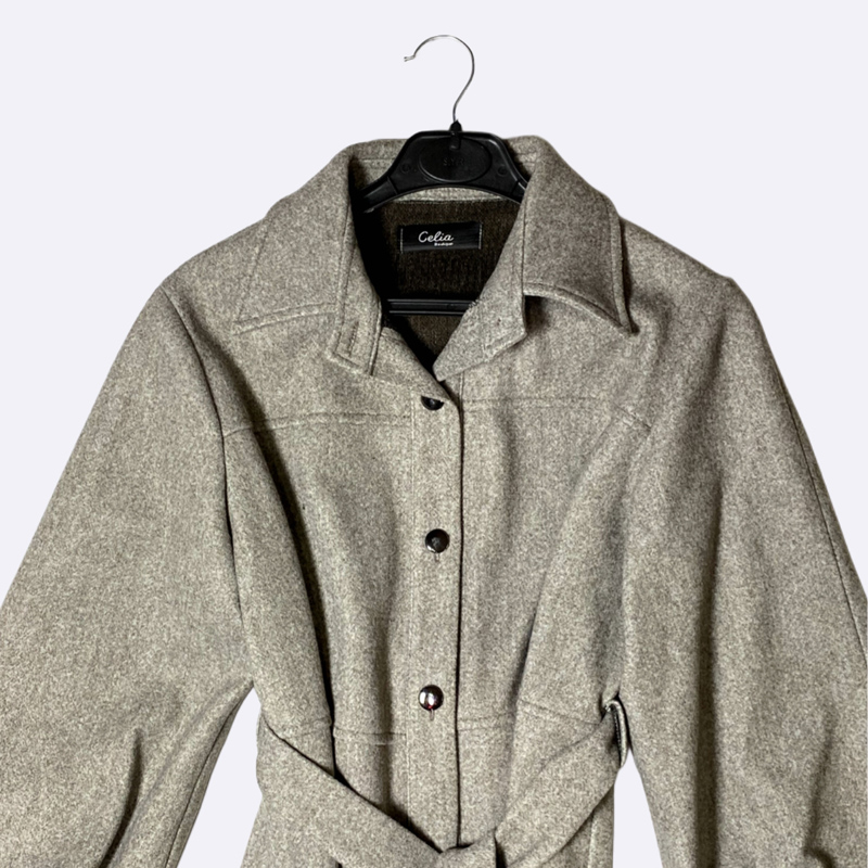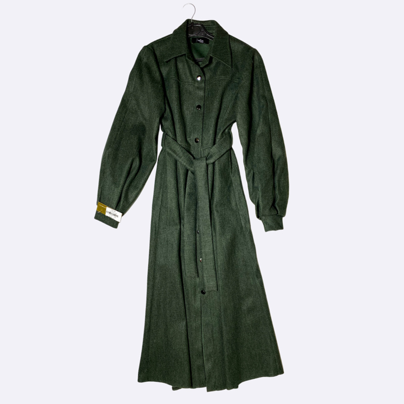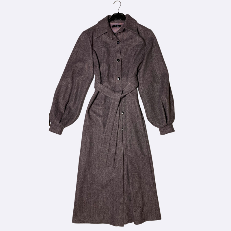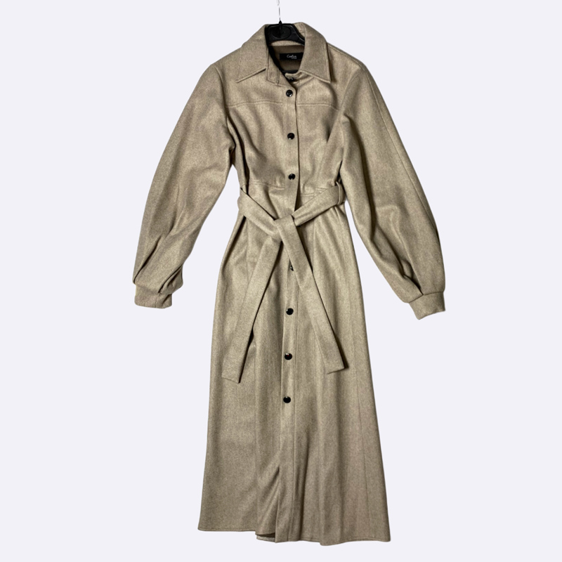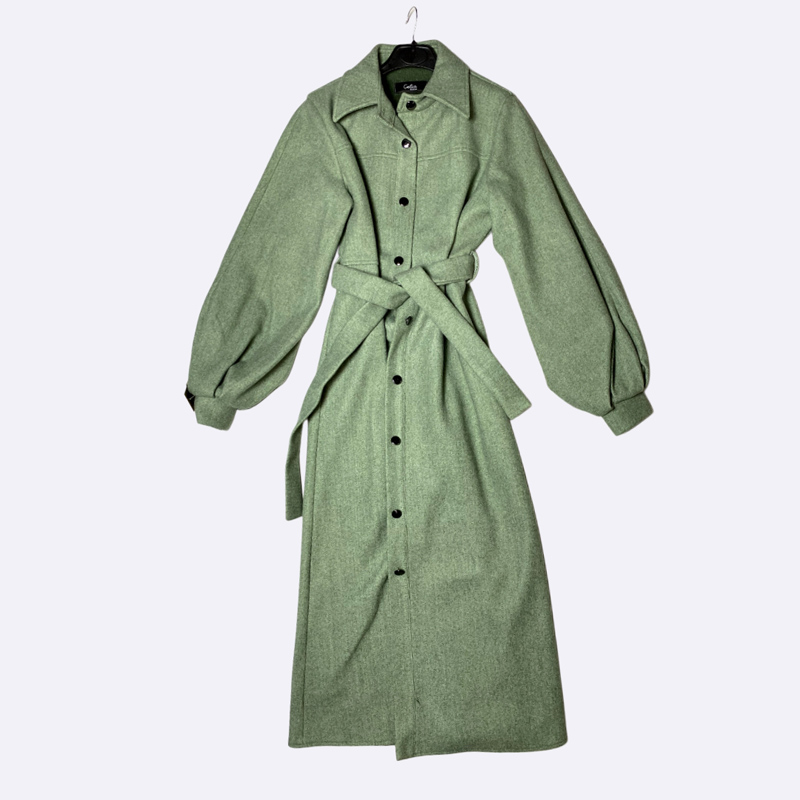 معطف نسائي شتوي طويل بقصة أنيقة ومميزة، يتميز بأكمام واسعة ومنفوخة وياقة كلاسيكية. مزود بحزام قماشي للخصر وإغلاق أمامي بأزرار. تصميم عصري ودافئ يناسب الإطلالات الرسمية والكاجوال.