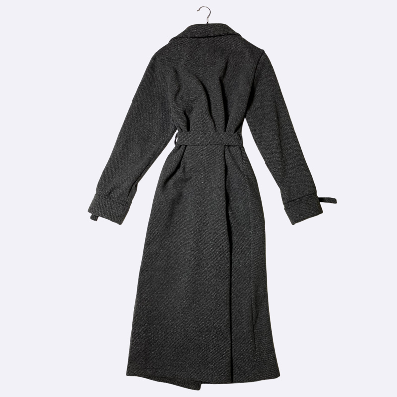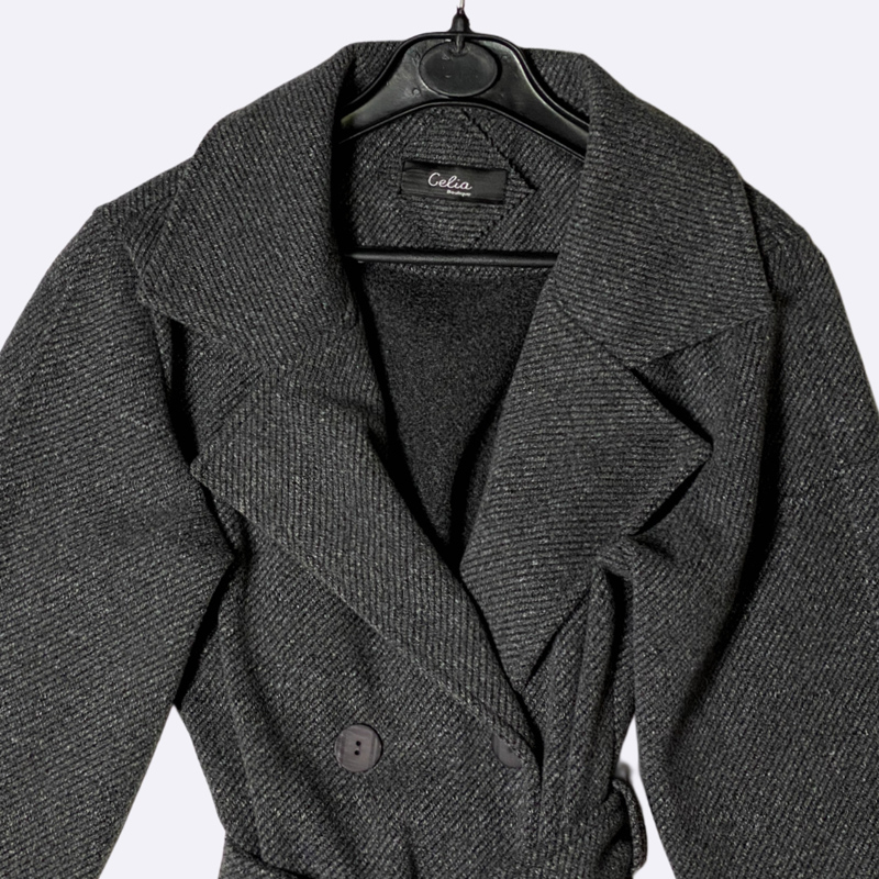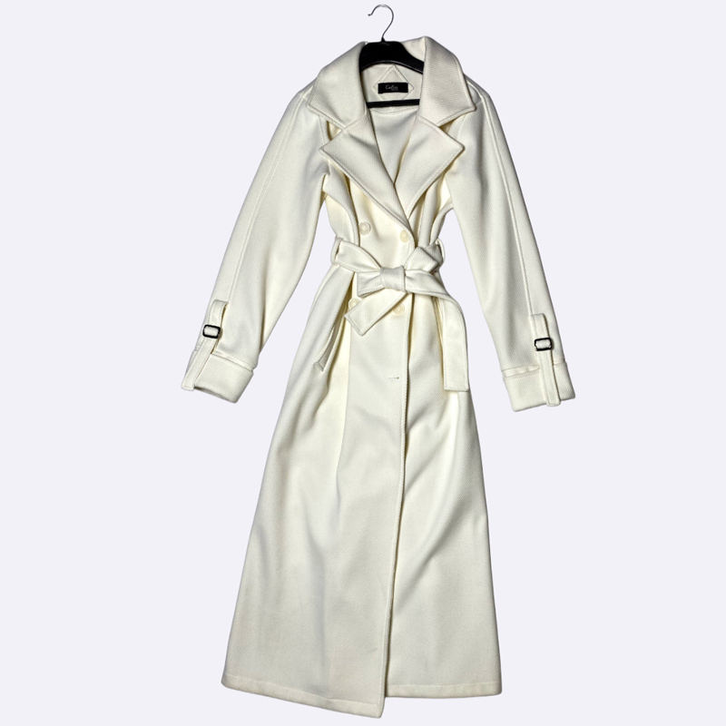 معطف نسائي شتوي طويل وكلاسيكي، يتميز بتصميم مزدوج الصدر وأزرار أمامية، مع حزام قماشي للخصر لتحديد المظهر. مزود بياقة عريضة وعروات تزيينية على الأكمام. يوفر الدفء والأناقة لموسم الشتاء.