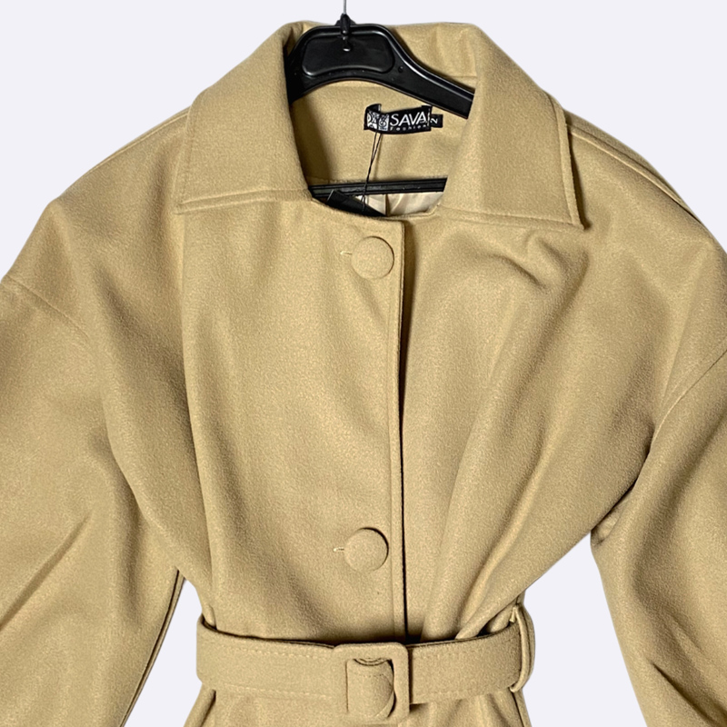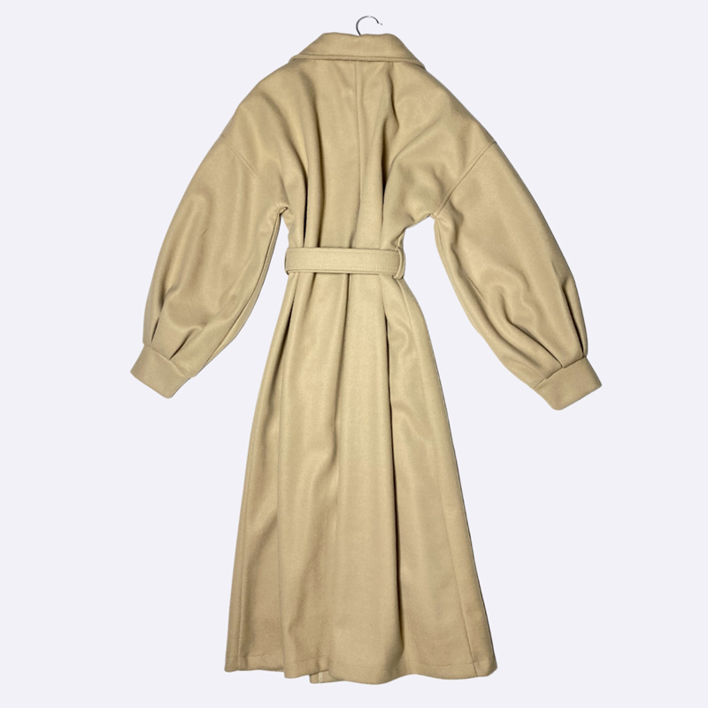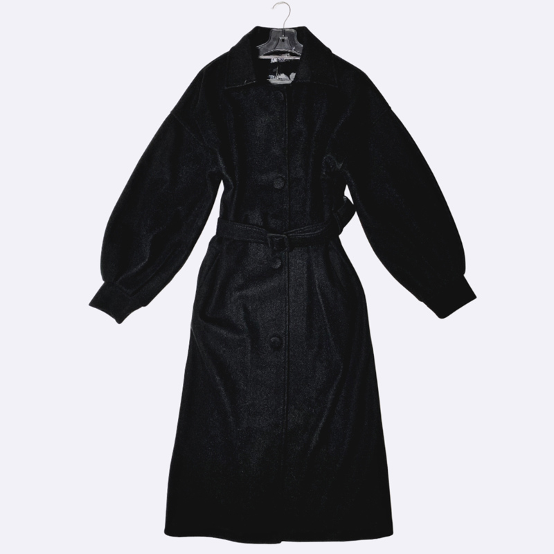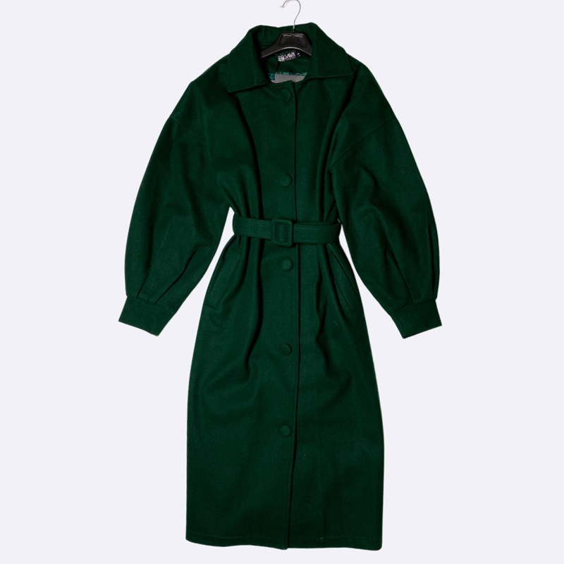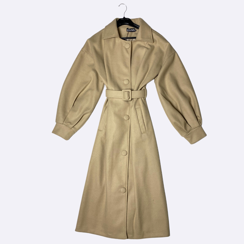 معطف شتوي نسائي طويل يتميز بأكمام واسعة ومنفوخة (بالون) عند المعصم. مزود بحزام عريض بإبزيم لتحديد الخصر وإغلاق أمامي بأزرار كبيرة. يوفر إطلالة عصرية وراقية مع الدفء اللازم