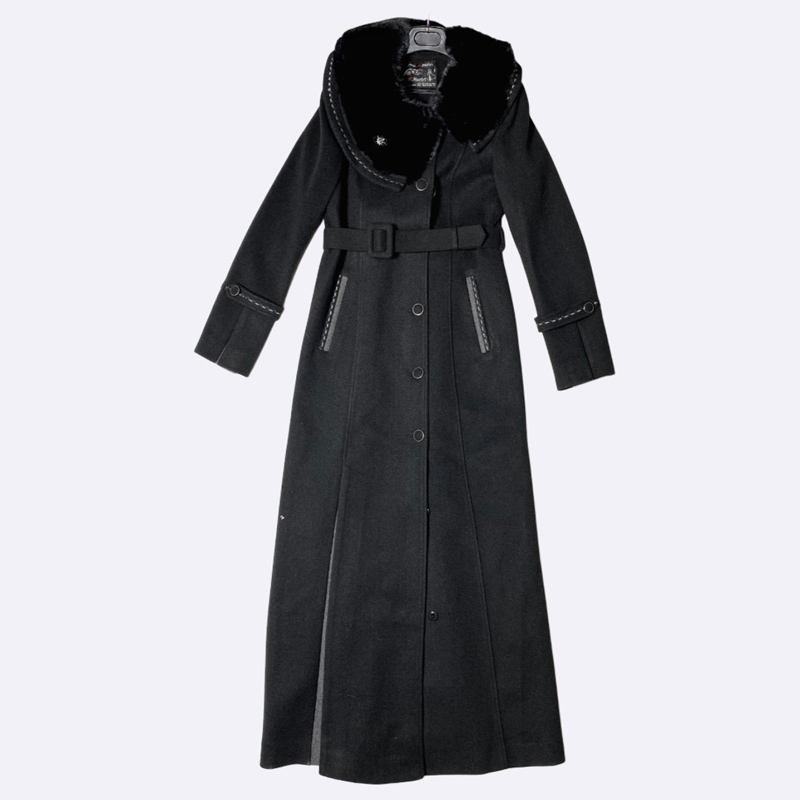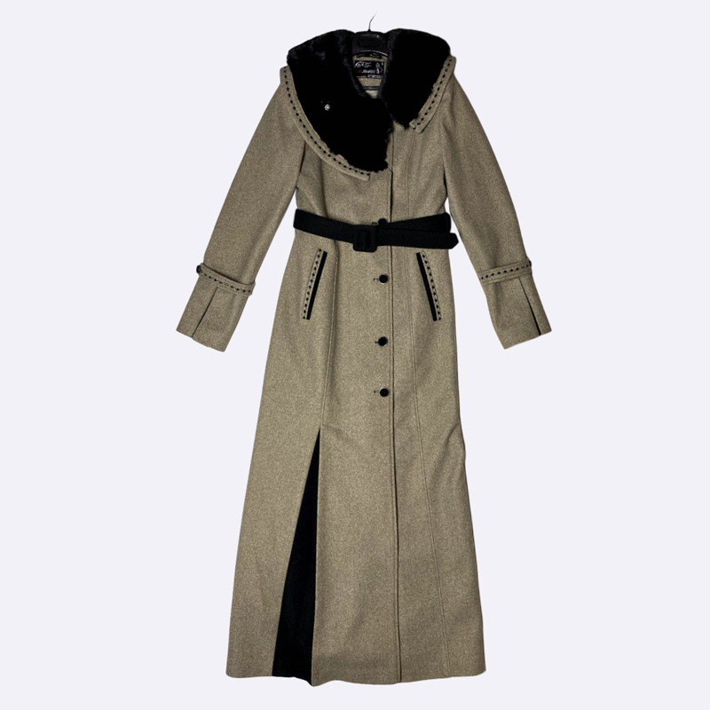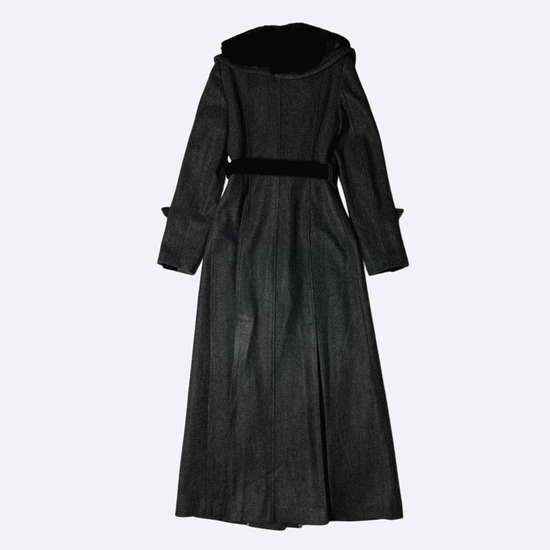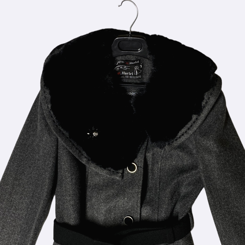 معطف شتوي طويل بياقة شال كبيرة مزينة بالفرو. إغلاق أمامي بأزرار، ومزود بحزام عريض للخصر. تصميم أنيق ودافئ للغاية.