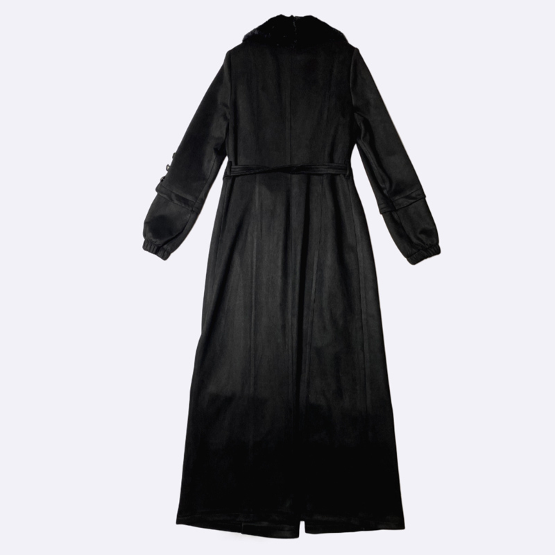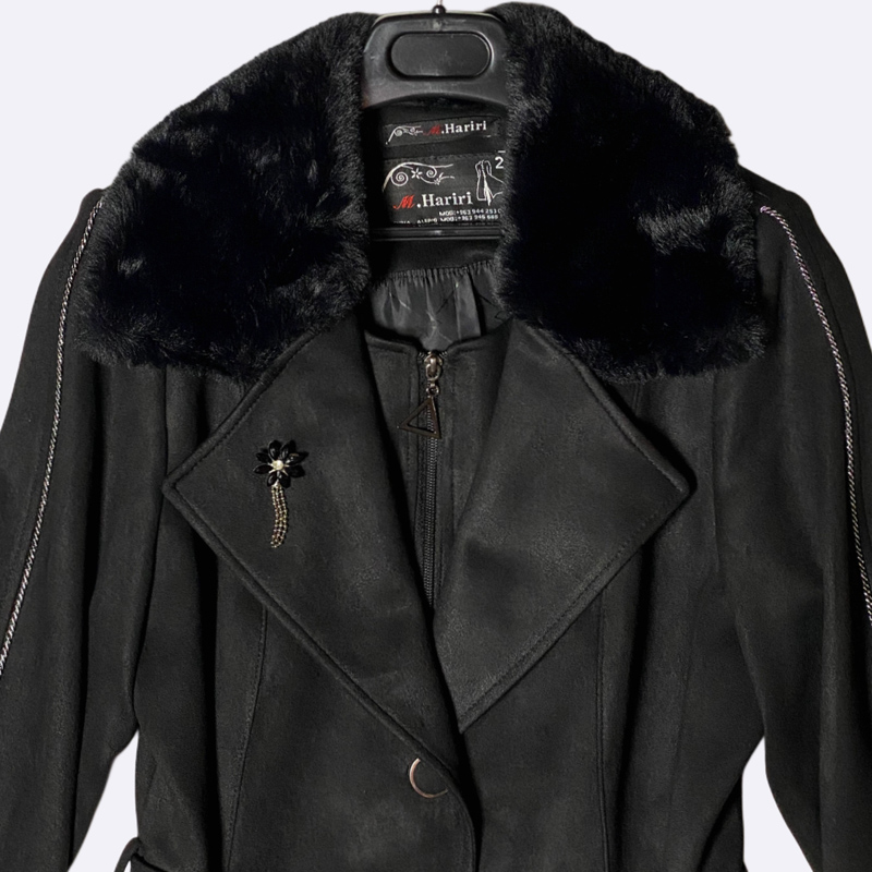 معطف شتوي طويل وفاخر بخامة مخملية. يتميز بياقة فرو، حزام قماشي للخصر، وتفاصيل سحّابات معدنية على الأكمام. إغلاق بأزرار مع سحاب داخلي.