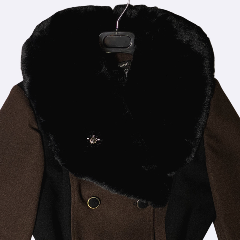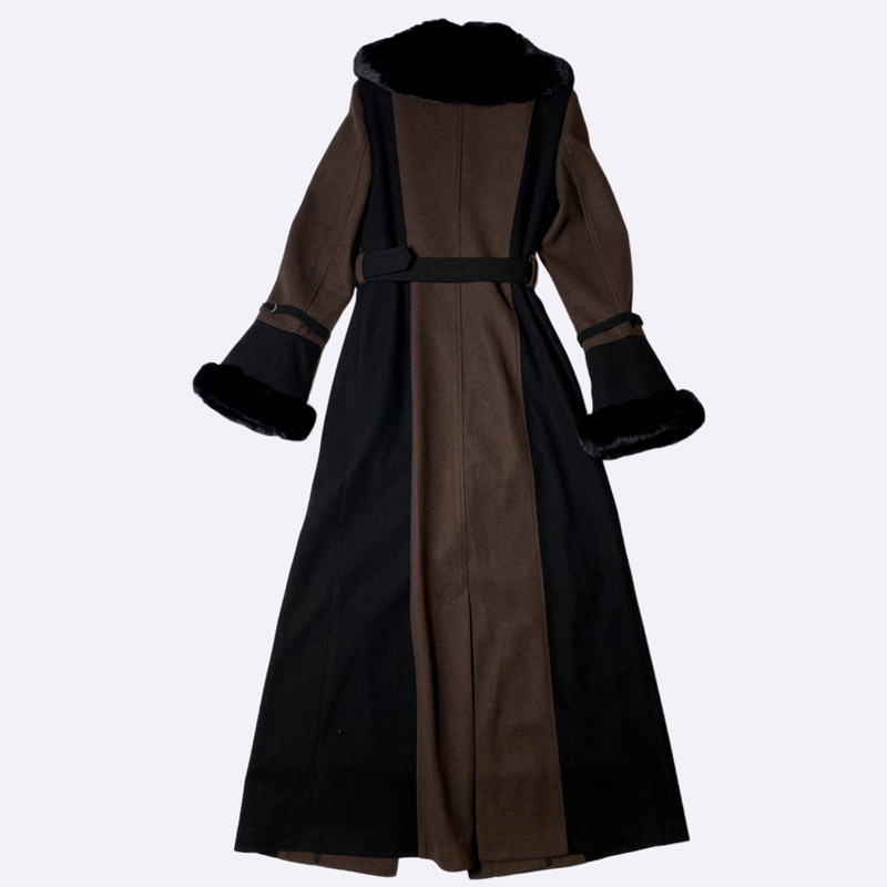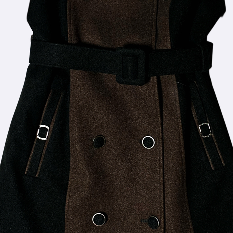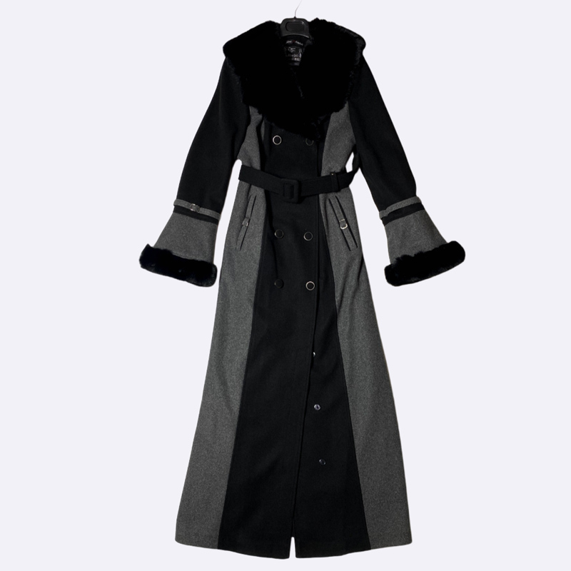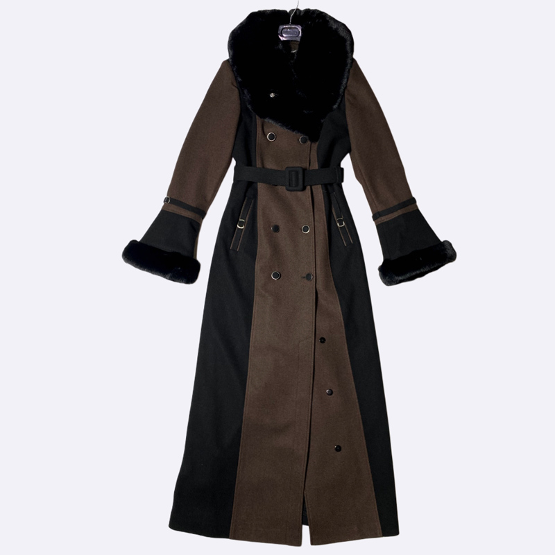 معطف شتوي طويل مزدوج الصدر من قماش الجوخ. يتميز بتصميم ثنائي الألوان وحزام خصر بإبزيم. مزود بياقة وحواف أكمام من الفرو الصناعي.
