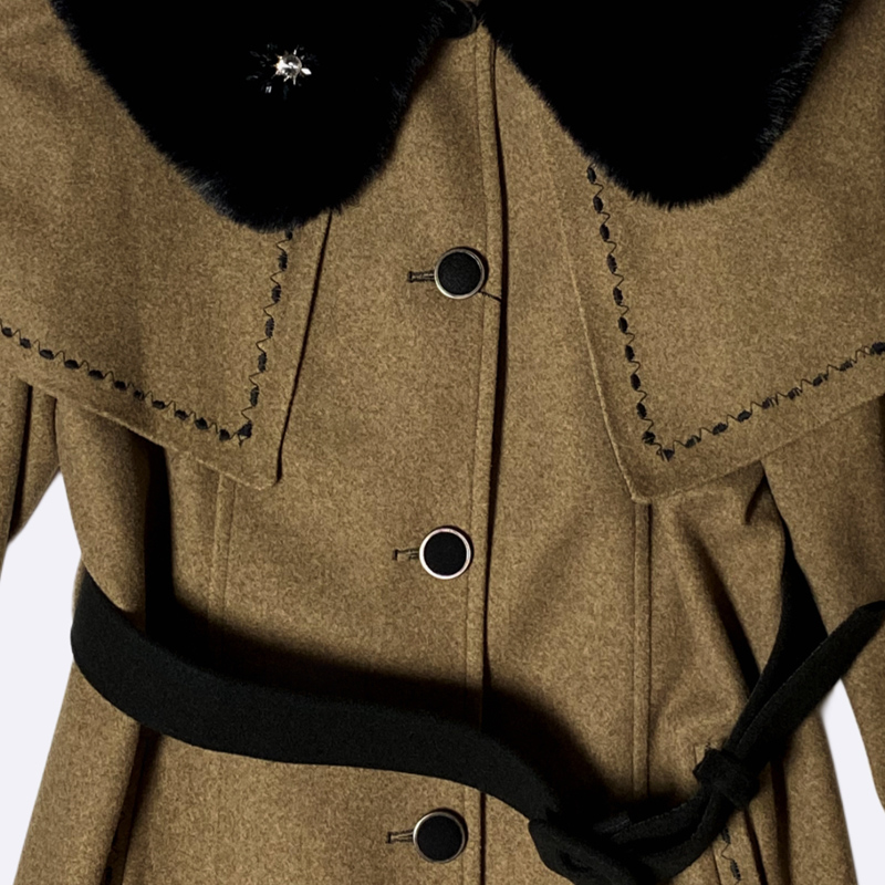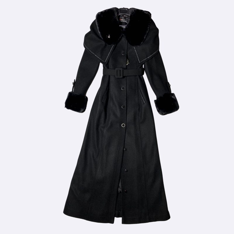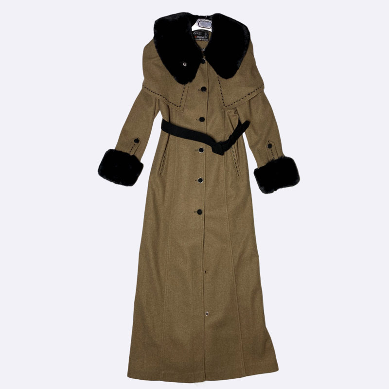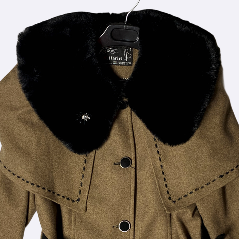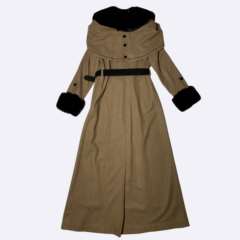 معطف شتوي طويل بخامة صوفية سميكة. يتميز بياقة كبيرة منسدلة وحواف فرو على الياقة والأكمام. مزود بحزام خصر للإغلاق وأزرار أمامية.