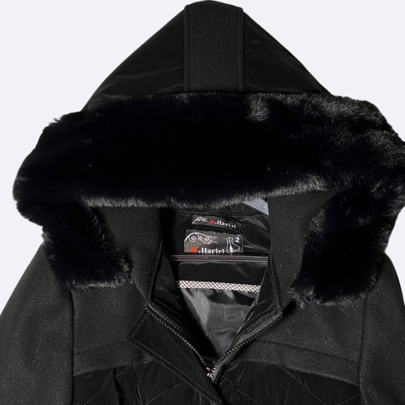معطف شتوي طويل مبطن بخياطة ماسية. مزود بغطاء رأس مزين بالفرو الصناعي وحزام خصر بإبزيم. إغلاق أمامي بأزرار، ومصنوع من خامات دافئة ومقاومة للماء.