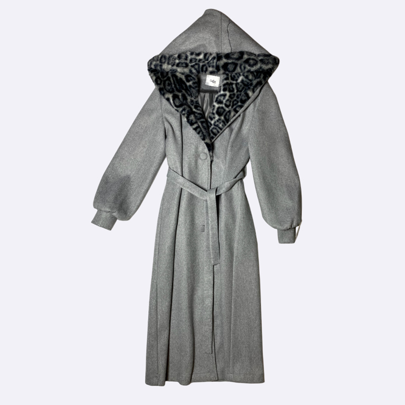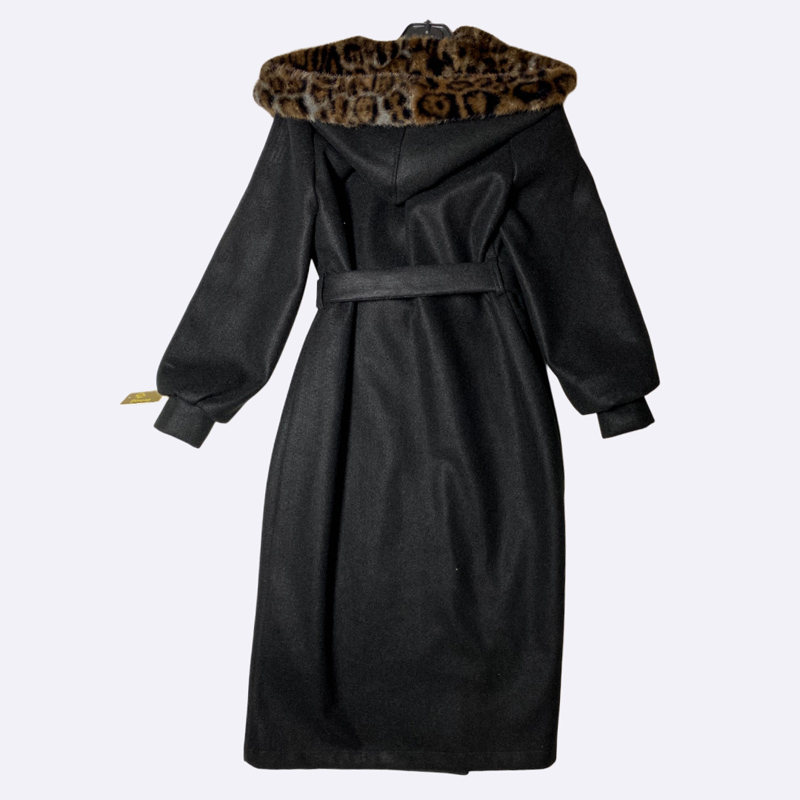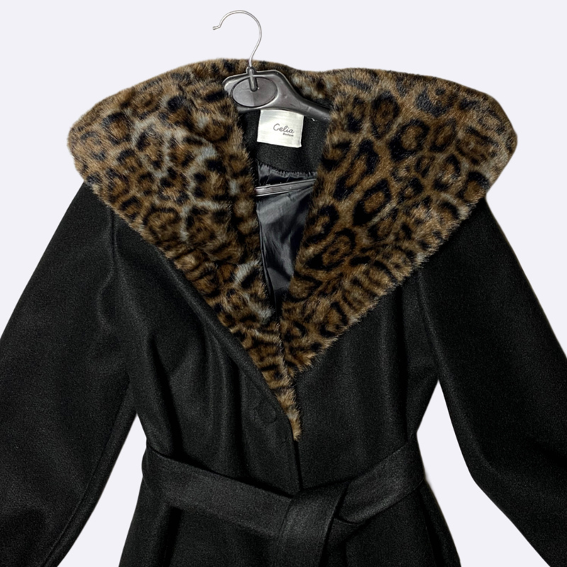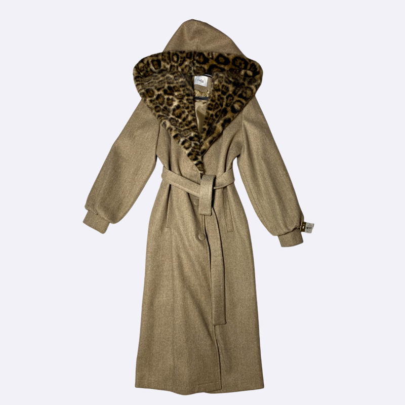 معطف شتوي طويل بخامة الجوخ الدافئة. يتميز بياقة كبيرة من الفرو الصناعي بنقشة الليوبارد. مزود بحزام قماشي للخصر وأكمام واسعة. تصميم كلاسيكي جريء.