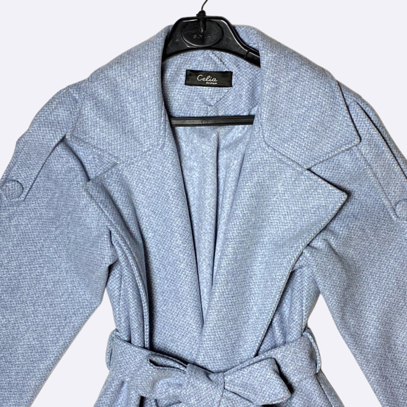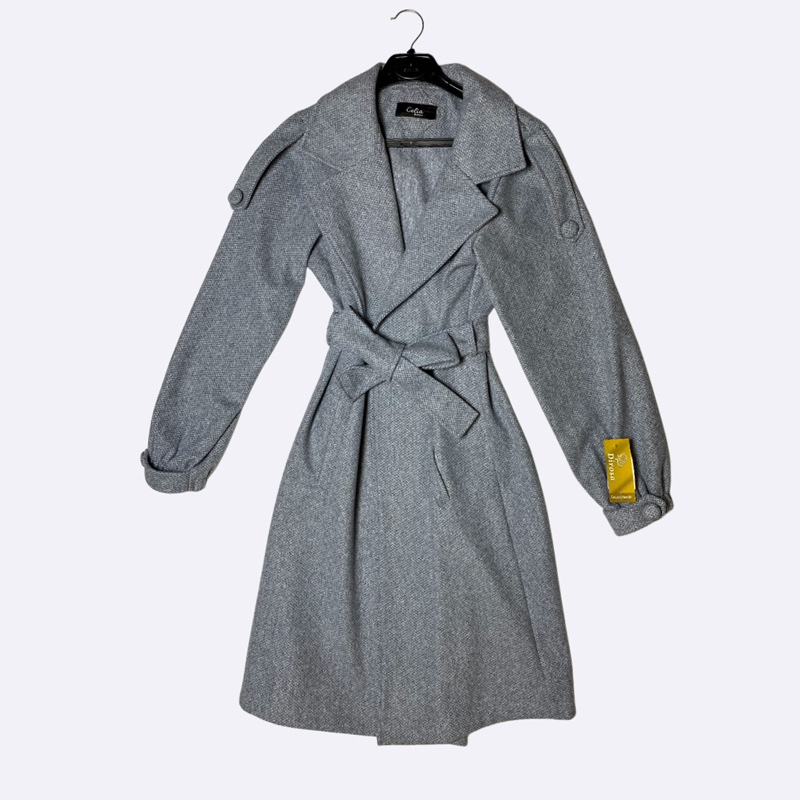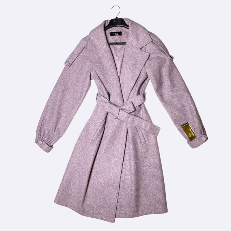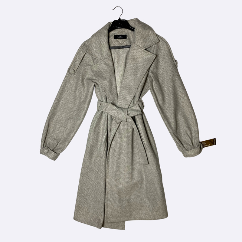 معطف شتوي بلف دافئ بطول متوسط. يتميز بغطاء رأس كبير وواسع وأكمام ذات نهاية مزمومة. يغلق بحزام خصر قماشي، وله قصة واسعة من الأسفل.