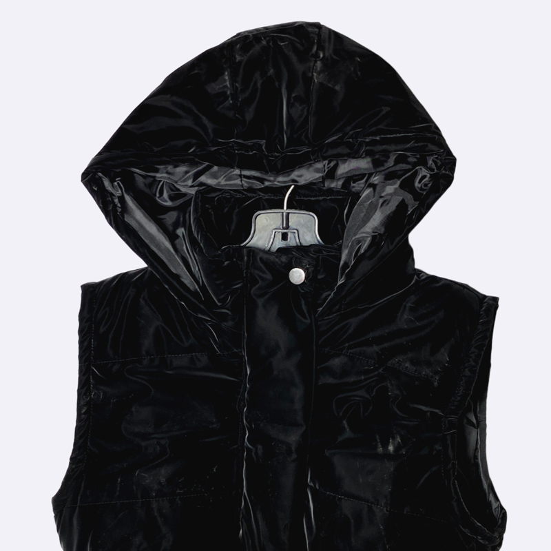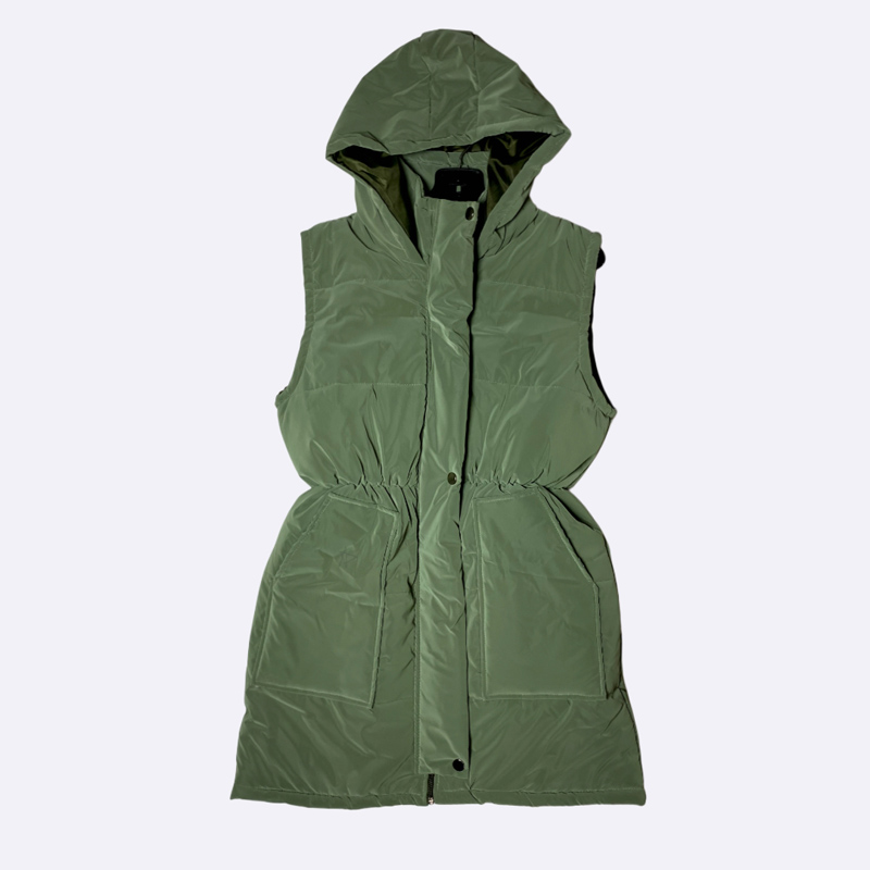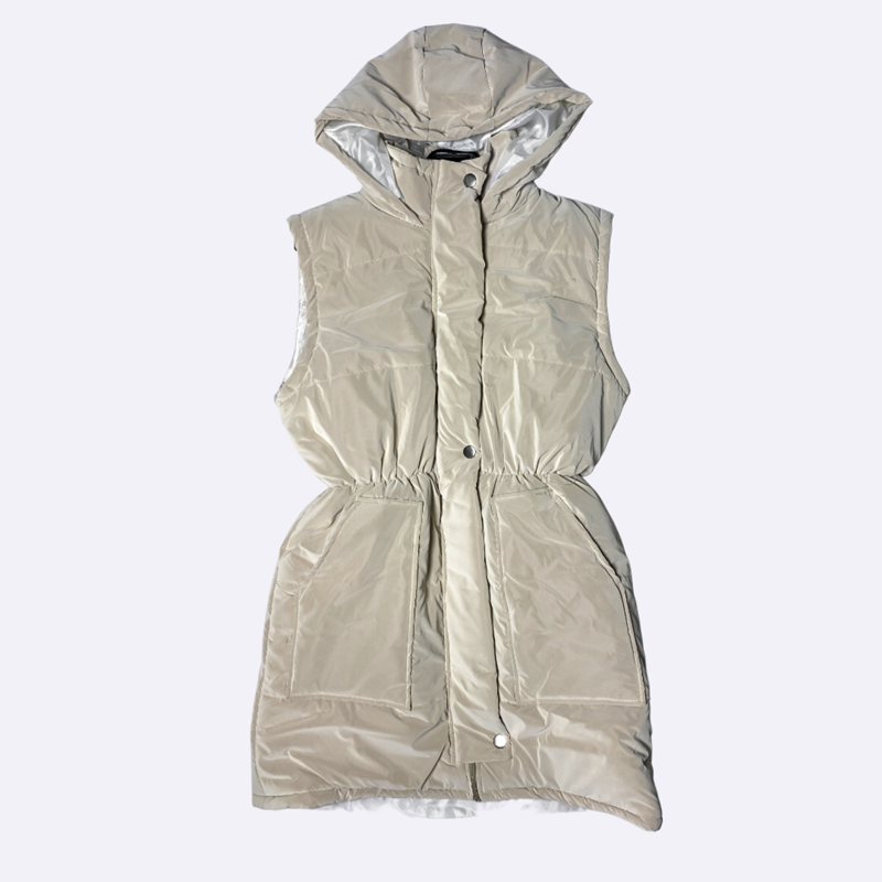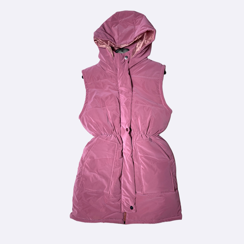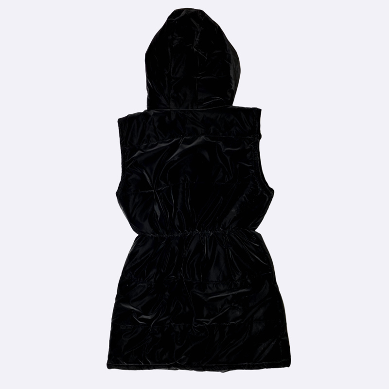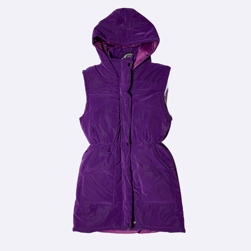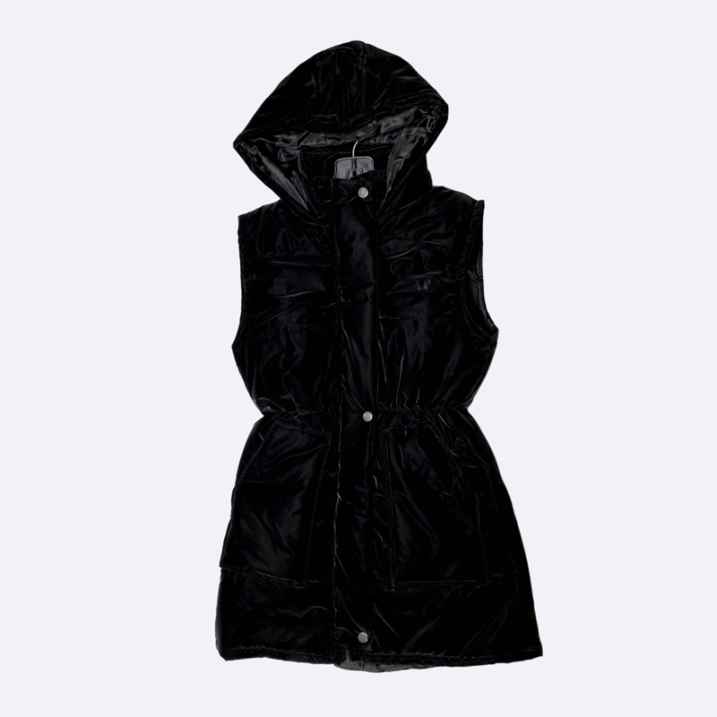صدرية نسائية طويلة مبطنة ومصنوعة من قماش المخمل اللامع. مزودة بغطاء رأس وخصر مطاطي برباط، وإغلاق أمامي بكباسين. مناسبة للارتداء فوق الملابس في الطقس البارد.