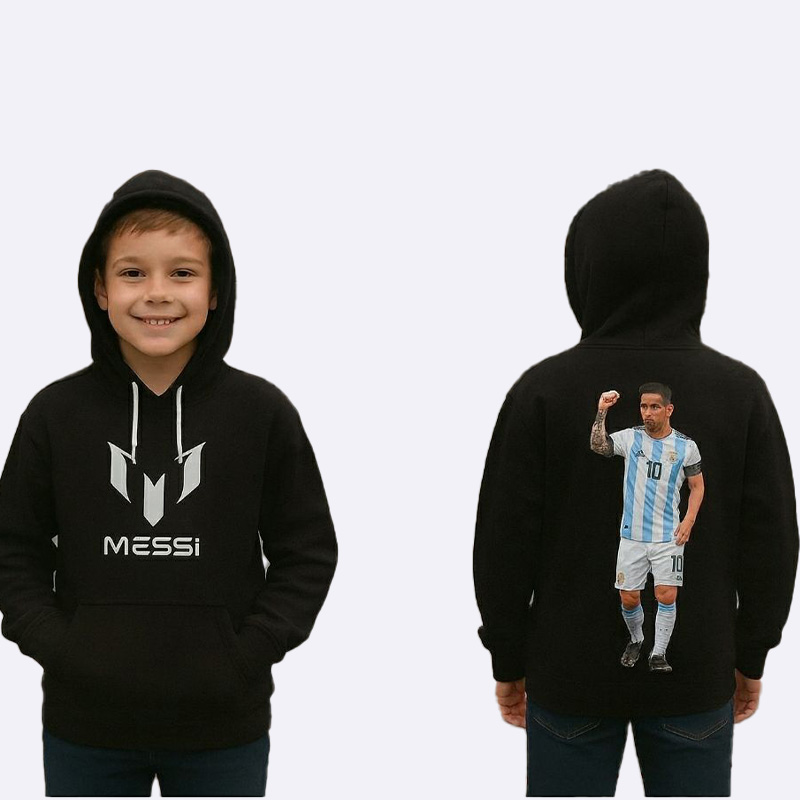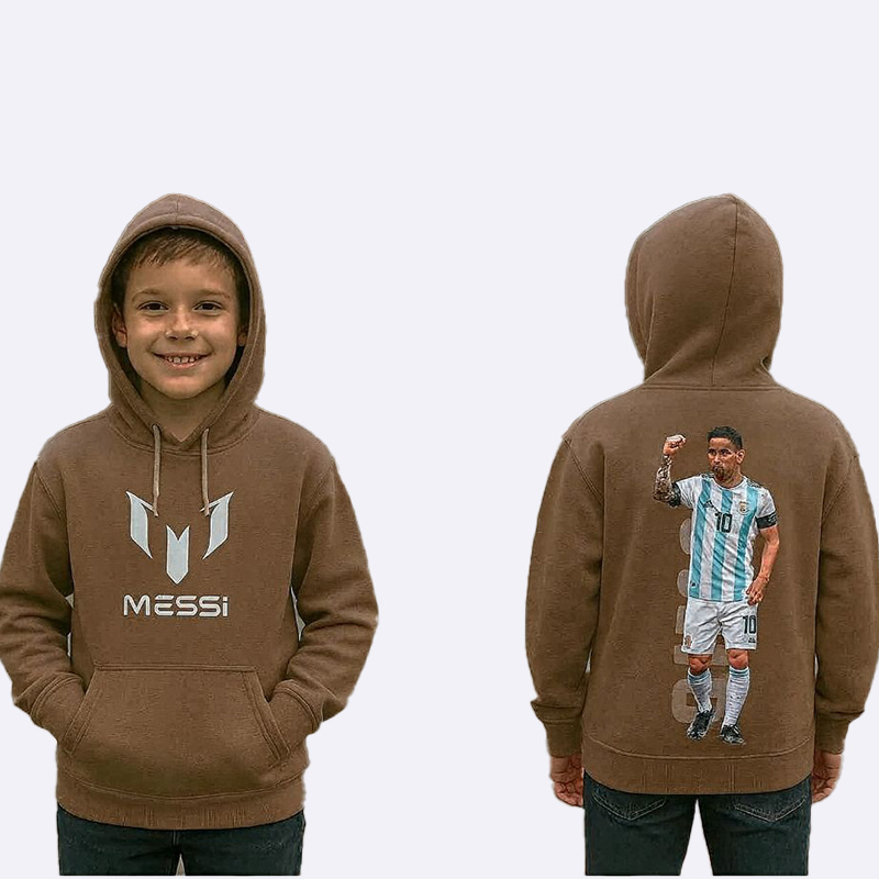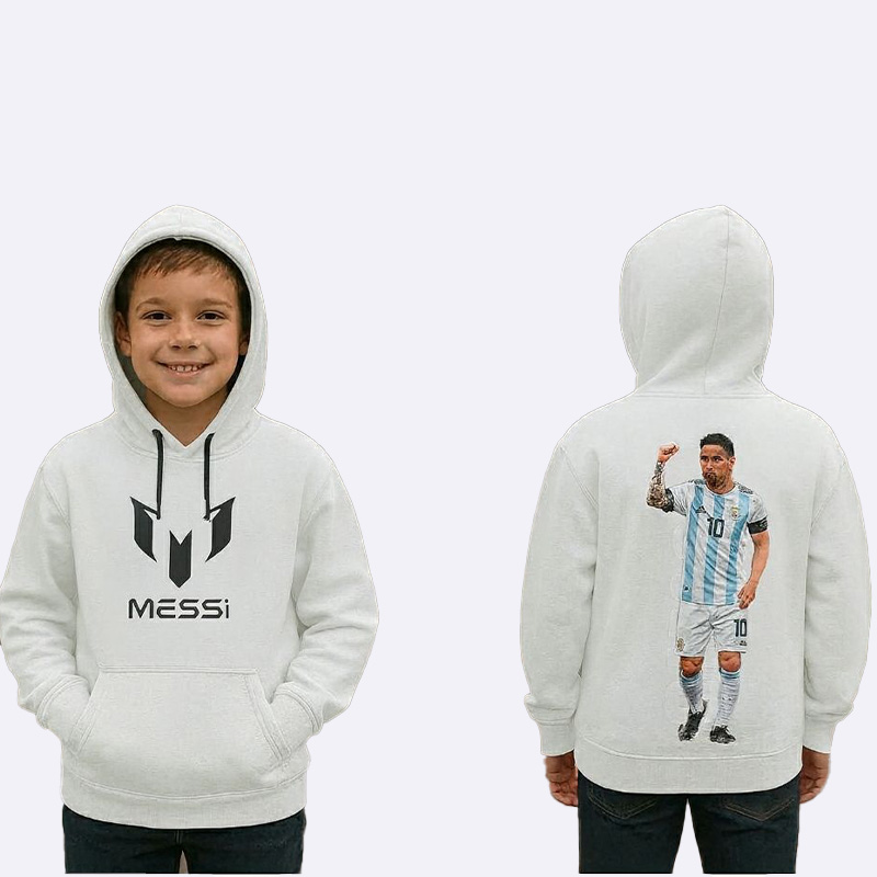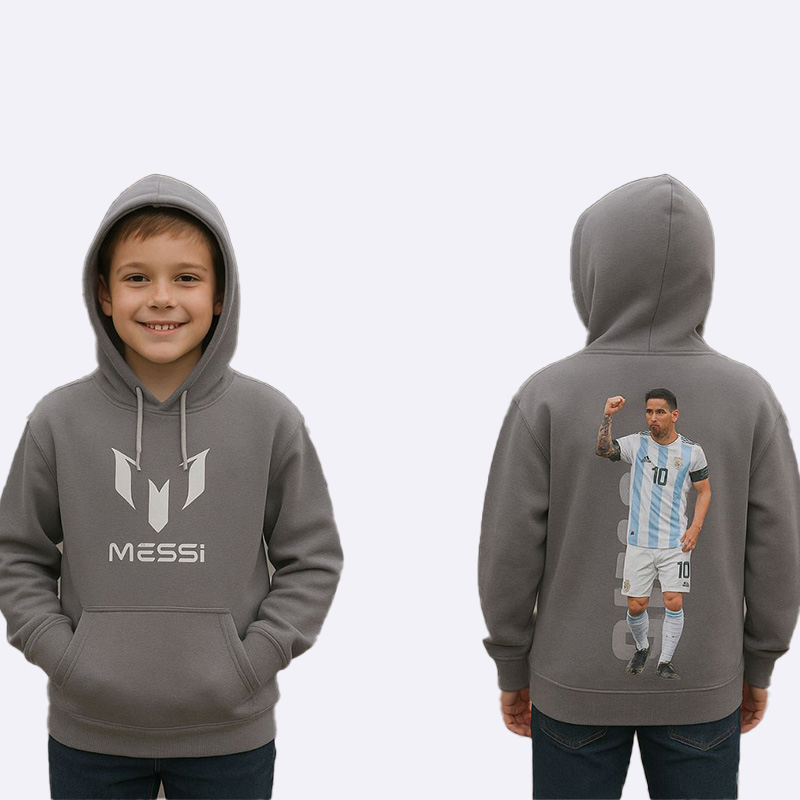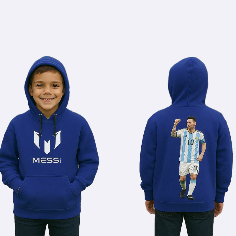 كنزة هودي شتوية دافئة للأولاد من قماش فليس مصوّف تركي، تتميز بطبعة كبيرة للاعب ميسي على الظهر وشعاره على الصدر، مثالية للدفء ومكفولة على الغسيل.