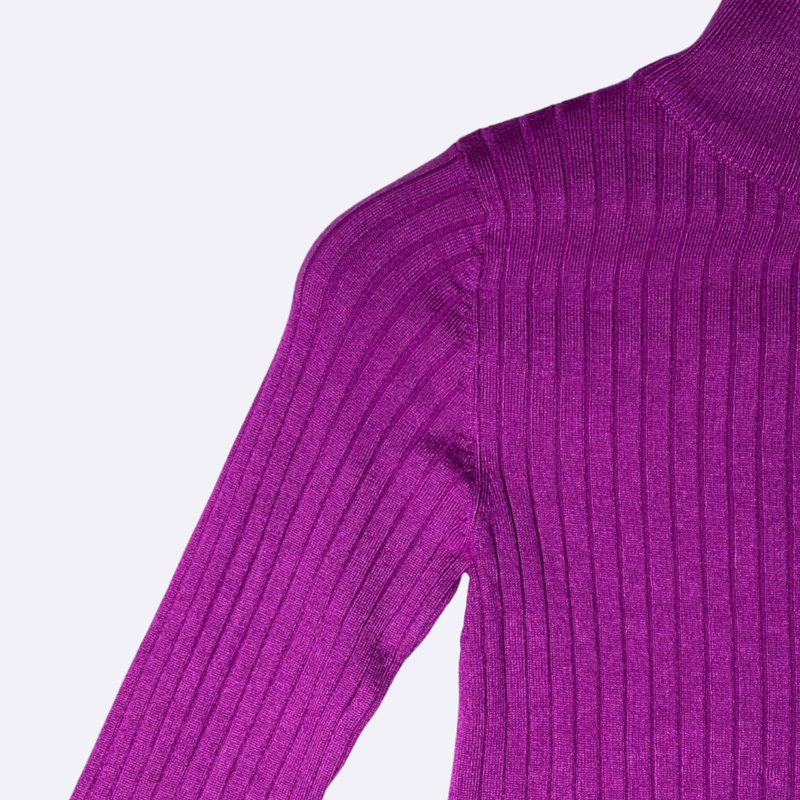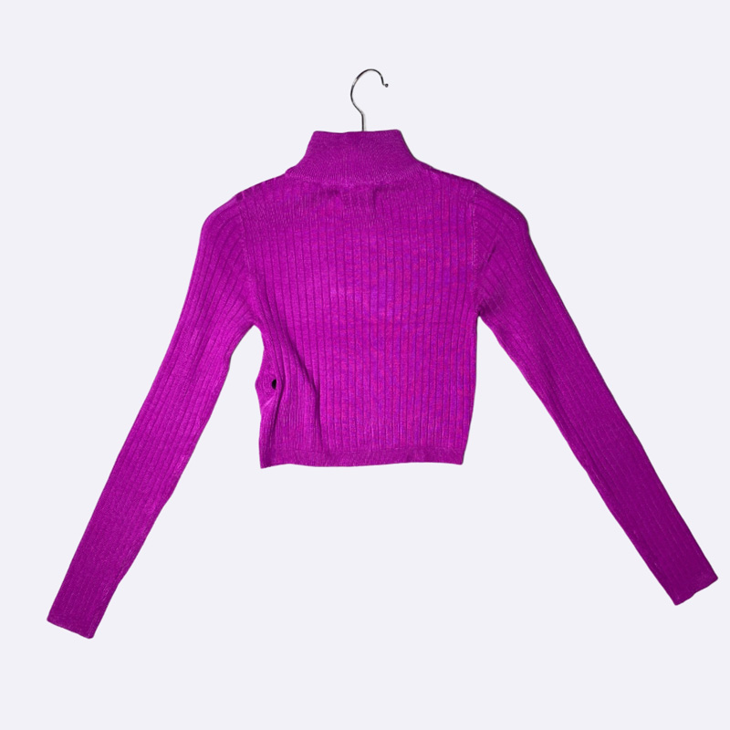 كنزة سينساي المضلّعة بتصميم قصير وبياقة عالية تمنح إطلالة عصرية ودافئة. خامتها مرنة ومريحة، مع أكمام طويلة وقصّة شبابية تناسب الإطلالات اليومية والكاجوال. اللون الحيوي يضيف لمسة جريئة إلى اللوك.