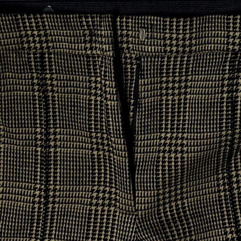 بنطلون نسائي رسمي بقصة ضيقة، يتميز بنقشة الكاروهات الكلاسيكية (Plaid) وشريط جانبي عمودي سادة على طول الأرجل.