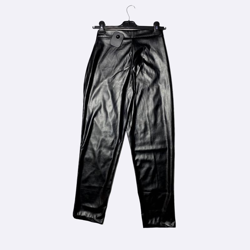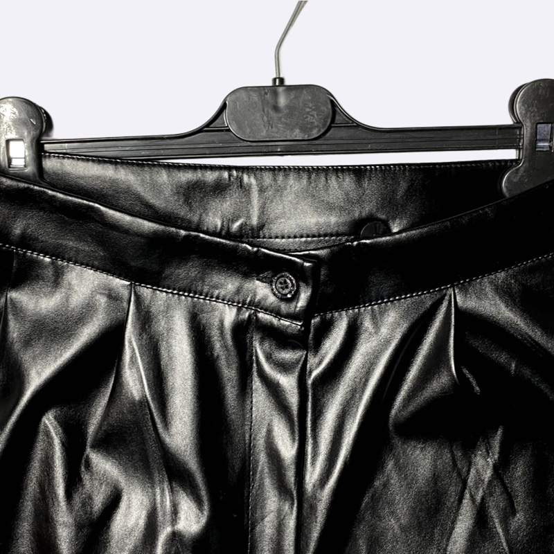 بنطلون أنيق من الجلد الصناعي الأسود بقصة مستقيمة وخصر عالٍ مزود بحزام.